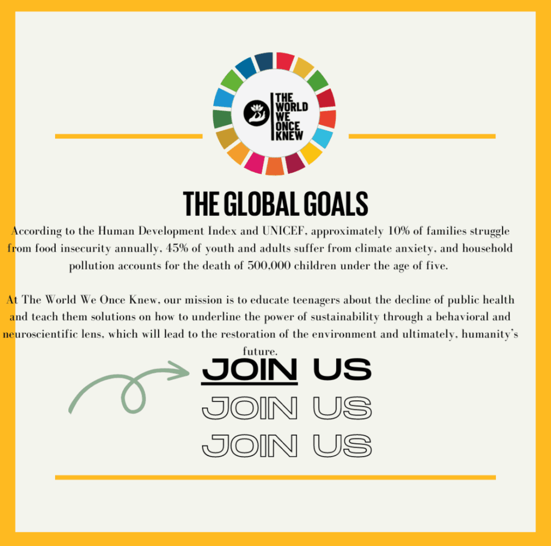 I further explored modules on how Responsible Appliance Disposal prototypes have played a role in sustainable development. Furthermore, I began communicating with professors, expanding on Bronfenbrenner’s Theory of Ecological Development in Children, examining how greenspace interacts with the child’s brain. I founded The World We Once Knew at the age of 15, the first non-profit organization where the emerging studies of neurotoxicology and modern global sustainable development empower the thinkers and advocates of future generations to reimagine the field of environmental health. Today, the World We Once Knew has reached over 20 countries globally and is a member of the Youth Climate Movement or International Youth Climate Movement (YOUNGO). I am also incredibly proud to announce that I will be a member of the Health and Agriculture and Food Working Groups at YOUNGO!