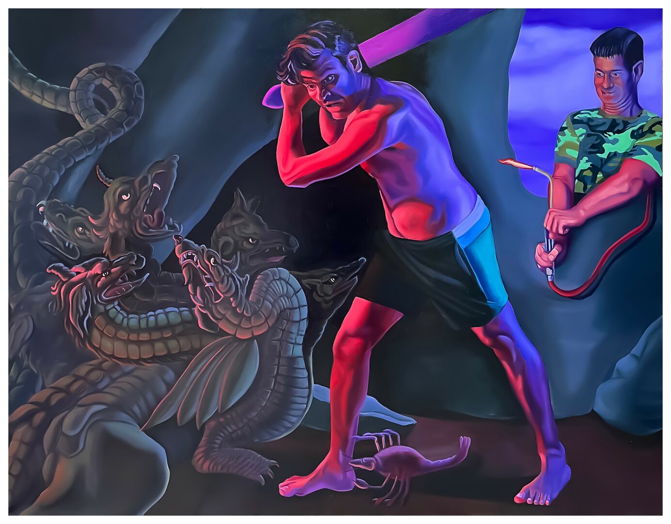 Based in the Hudson Valley, New York, I am a painter whose large-scale figurative canvases offer a vibrant and surreal commentary on art history. My academic background, cemented by a BFA from Indiana University and an MFA from the San Francisco Art Institute, grounds a practice focused on deconstructing and re-contextualizing antiquated themes. My work is visually arresting, utilizing a bold, colorful palette to subvert historical narratives and turn patriarchal tropes on their head. My most recent body of work specifically reexamines traditional ideas of masculinity and redefines them in complex, modern terms. What makes my paintings distinct is my frequent self-insertion into these grand, operatic scenes. By placing my own figure directly into the allegorical compositions of the past, I not only implicate myself in the narrative but also actively write my own identity into the canon of art history, asserting a contemporary claim to these historically exclusive visual spaces.