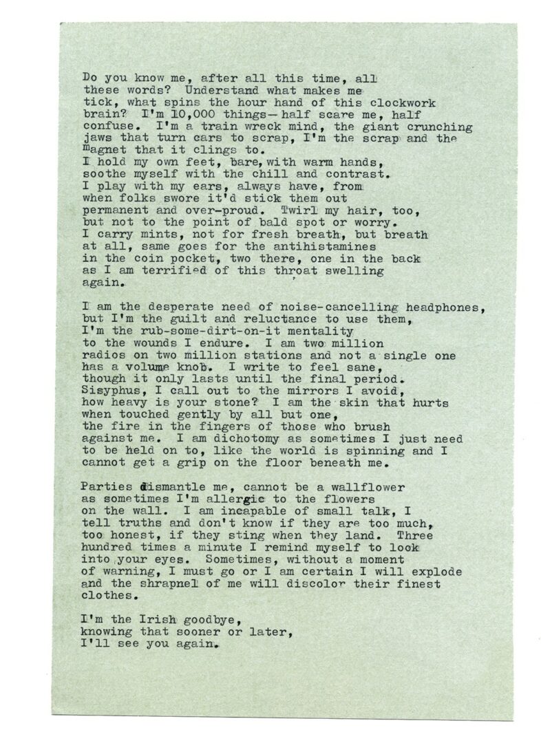 It started as the writing, and it’ll always be the writing. I get lost in words, I get lost in the attempt at making them spin together in some beautiful way, in translating them from nothing to something. I have always said I feel more like a conduit than a conductor when I write, and I think it’s here where I get the most lost, in order to be the most found. Being Autistic, there are VERY few times in a day, a week, where I just get to feel myself disappear. Writing is one. Always has been. Hopefully always will be.