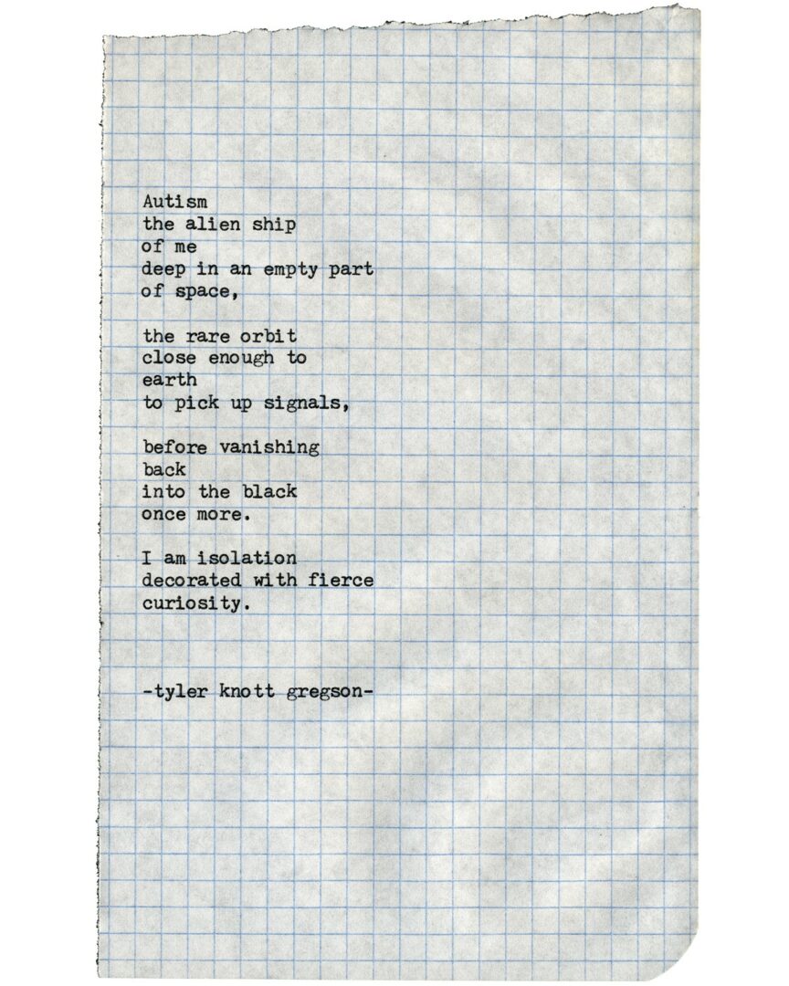 I am Tyler Knott Gregson, an Autistic poet, author, and professional photographer that lives in the mountains of Helena, Montana. I’ve been struck by lightning, I’m allergic to more foods than I can count, and I’ve written well over 4,000 poems. I have 6 books of poetry, and a children’s book I wrote with my wife, Sarah Linden Gregson, who also travels the world with me as my business partner with Chasers of the Light, our photography company.