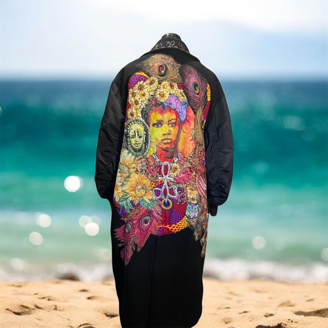 Ever since I took a leap of faith after my dear father’s death when I heard the inner call to “Do it NOW!” I’ve been working in my very unique niche of creating wearable art pieces, that tell the wearers personal story in images, symbols, colours and sometimes words. These robes serve as ‘soft armour’: a way of presenting the self in social settings in a non verbal way, replacing the need for small talk and encouraging and seeding conversation around the robe. As an autistic creative, I first created this for myself as an accidental expressive social ice breaker, and now my mostly neurodivergent clients feel the same benefits when wearing their own personal storytelling robes. On the surface they are glamorous, extroverted garments inviting the wearer to take up visual space, on a deeper level they serve as a social lubricant in social settings. This is me!