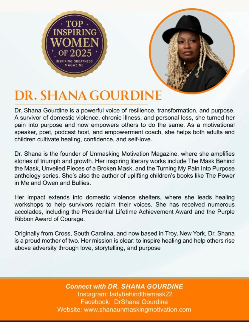 My name is Shana Gourdine, and I’m a poet, author, motivational speaker, and empowerment life coach ,but more than anything, I’m a woman who turned her pain into purpose. I’m the founder of *Shana Unmasking Ministries* and *Unmasking Motivation Magazine*, platforms created to uplift, educate, and empower others to heal from trauma and walk boldly in their God-given purpose.