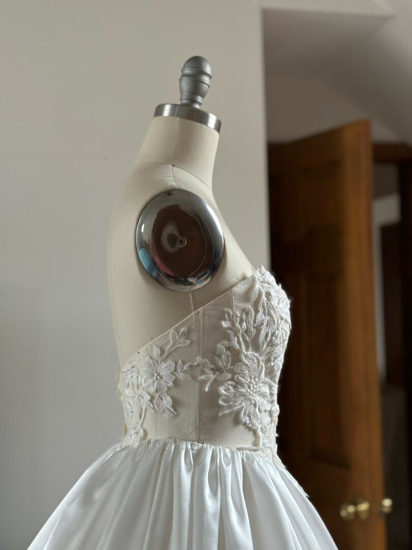 But I dug myself out, got a corporate day job for survival and distraction, and am grateful to have supportive people around me who provided the space I needed to both unravel and rebuild. My parents let me relocate my studio, equipment and the inventory I’d spent years collecting to their home, stored and ready for when I was. At the time I was doing more bridal consulting but did have to cancel one custom order in progress- a royal blue mother of the groom gown. The piece was at least 85% complete, far enough along to hand over to a tailor; only needing minor adjustments to the bodice, zipper and appliqué placement, and a hem once she selected shoes. The wedding was still months out but I imagine the client was irate. I returned the deposit and gave her everything, including all the pattern work, and assumed the time, money and material loss.