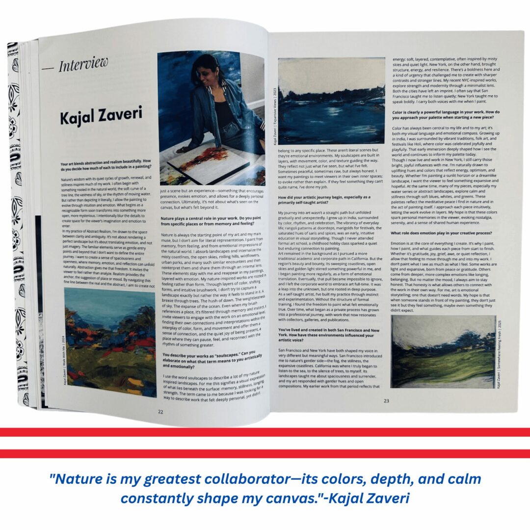 I am a New York–based artist, originally from India, working in Abstract Realism with a focus on expressive landscapes. Inspired by nature’s energy, resilience, and tranquility, I use layered paint, textured brushstrokes, and bold palettes to capture fleeting impressions and memories that evoke reflection and connection. Largely self-taught, my work bridges the influences of Impressionism and Abstract Expressionism, resulting in a style that is both personal and universal. My paintings have been exhibited internationally, featured in Elle Décor, Hyperallergic, and New Visionary Magazine, and showcased at major art fairs including Art Market San Francisco, Spectrum Miami, and Red Dot Miami. Beyond my studio, I lead inclusive art workshops and collaborations with museums and NGOs, and I am currently developing new series inspired by both the resilience of New York City and the meditative stillness of natural landscapes.