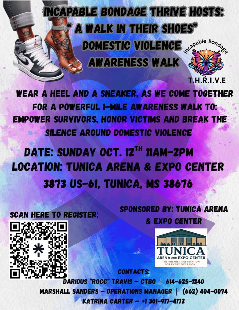 At Incapable Bondage Thrive, we empower trauma survivors through a holistic approach by providing long-term mental, emotional, financial, and physical resources so that they can thrive and reach their full potential. I am currently working on a walk for domestic violence, where participants wear one heel and one sneaker, while walking a mile.