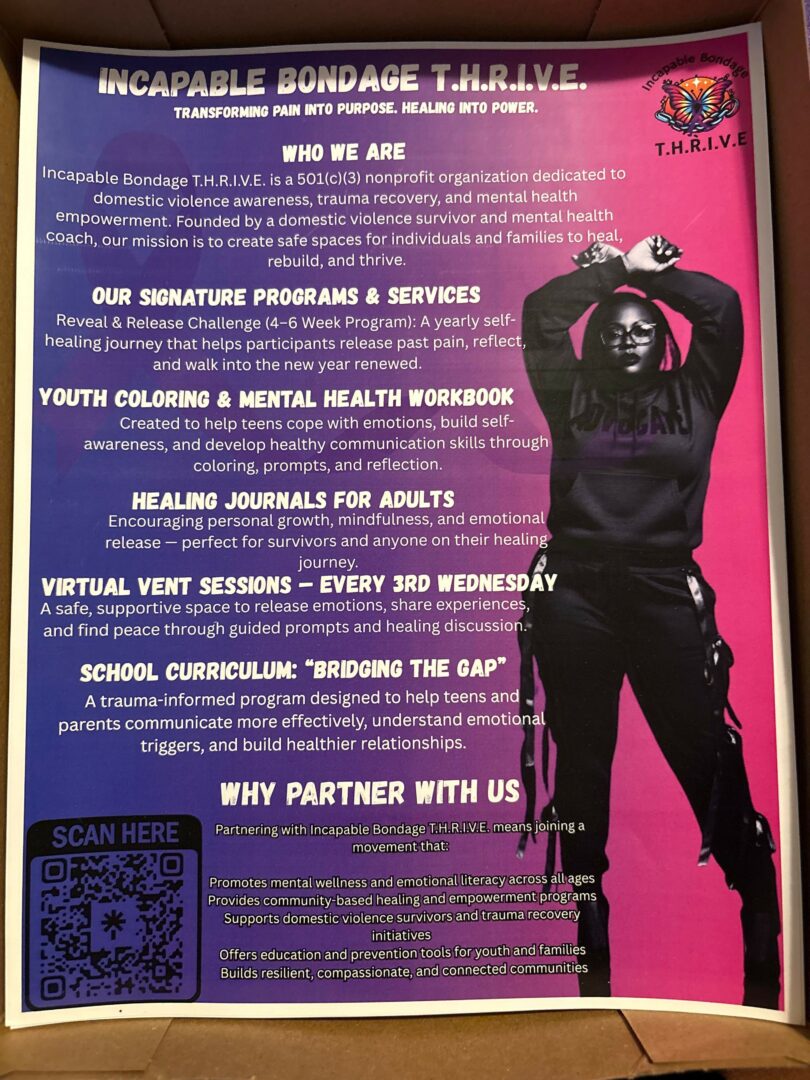 At Incapable Bondage T.H.R.I.V.E. mental health coaching and motivational speaking, our vision is to create a world where trauma survivors are not defined by their past but empowered by their resilience. We envision a future where every survivor has access to comprehensive and holistic support, encompassing mental, emotional, financial, and physical resources. Our commitment is to nurture an environment where survivors can heal, grow, and flourish, enabling them to break free from the chains of their past and realize their fullest potential. Through our unwavering dedication, we aim to build a community that fosters strength, restoration, and the limitless possibilities of thriving beyond adversity.”
