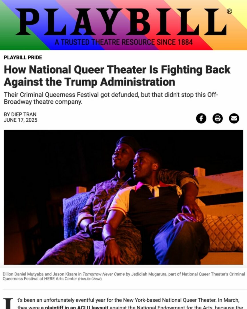 There’s a lot of fear in the air in the United States at this moment. It feels like our government is punishing any institution that promotes diversity, labeling them as ‘woke.’ They are censoring our art and our history, hoping to eliminate any criticism of our government or our country. But in a democracy, it is incumbent on all of us to put in the work to make our country more free and equal for everyone. As a queer person, I know that America has not always operated with my community’s best interest in mind. It would be easier to be silent right now in the face of increasing authoritarianism. But if we are not vocal about our civil liberties now, we may not have the chance to be later. In March, National Queer Theater joined the ACLU and other theaters in a lawsuit against the National Endowment for the Arts over their ‘gender ideology’ ban. In May, the NEA revoked a $20,000 grant for our Criminal Queerness Festival. This is retched behavior, and every American should be concerned by the gross government overreach happening right now. We will not be censored, and we will continue fighting for queer liberation, especially for our youth.