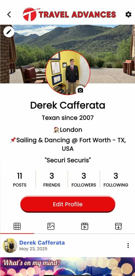 I’m Derek Cafferata, Chairman of TRAVELADVANCES.COM — the world’s first travel-centric social platform powered by emotionally intelligent AI. After leading ALLSTATEFF.COM and helping entrepreneurs build lasting ventures, I saw an opportunity to reimagine travel as something deeper: a shared, intuitive experience shaped by story and connection.