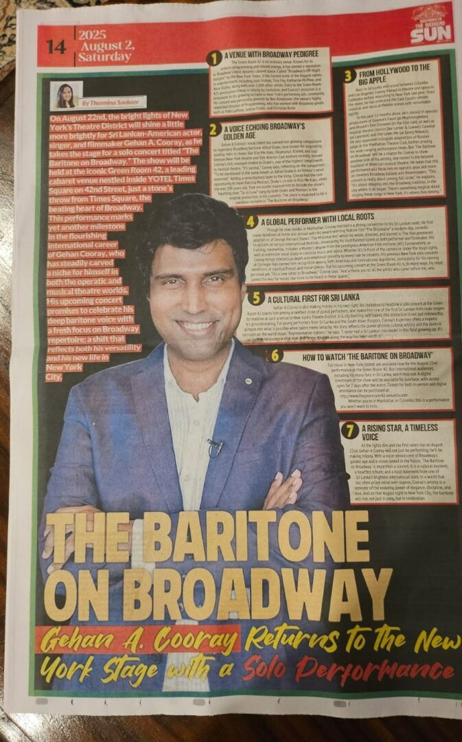 The partner of a critic who attended my most recent Solo Concert on 42nd Street here reiterated this by saying that she too had been reminded of Alfred Drake when I performed – and I must mention here that this latest solo show of mine itself is a moment of immense pride because it took place at the Green Room 42 near Times Square, which has been described as Broadway’s “swankiest” cabaret venue, and performance there is strictly by invitation only. Josh Groban himself has headlined there, and I am the very first singer born in Sri Lanka who was invited to do my own show!
