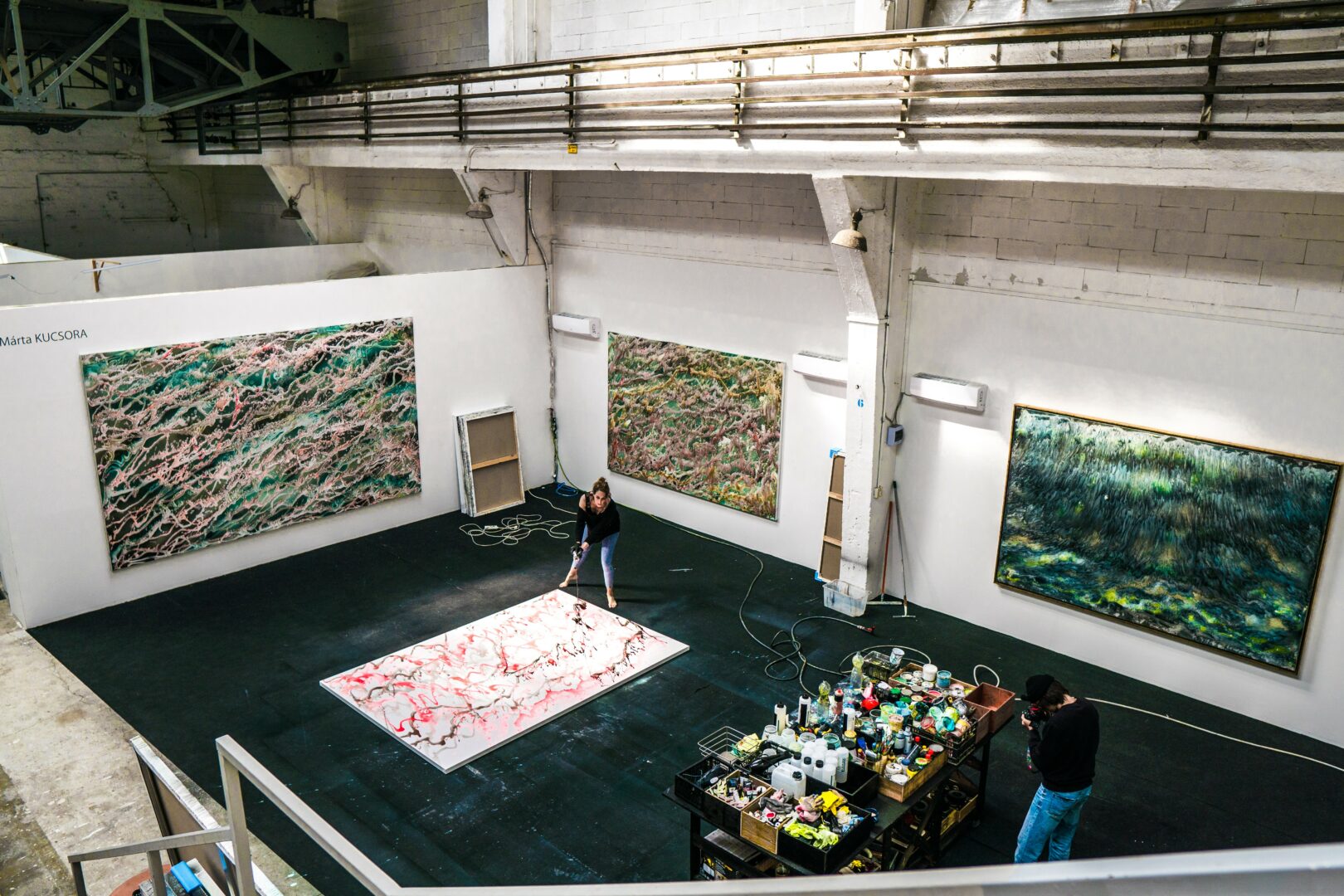 My solo exhibition INCEPTION at Kunsthalle Budapest (Műcsarnok) in 2021 was a defining moment. It included monumental canvases — some reaching 3 × 5 meters (approximately 10 × 16 feet) — and a site-specific video installation, SUPERNATANT, created with analogue recording and natural sound. The installation evoked the sensation of a man-made universe in motion, merging human gesture with elemental resonance. To realize such a show, one must be both visionary and meticulous: every logistical step — from stretching canvases of that scale to coordinating sound, light, and installation — required precise planning and stamina.
