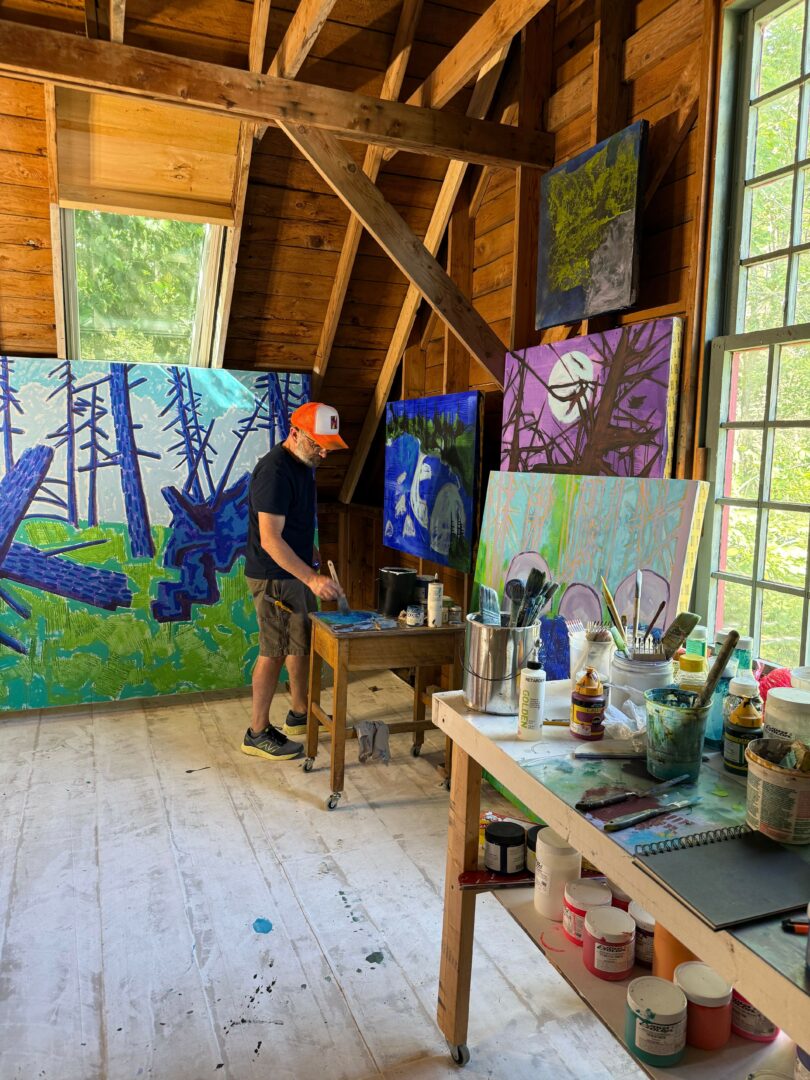 I have several places where I feel most at peace. In the studio with paintings in full swing and all of the smells of different paints and inks. In bed with my wife, 3 dogs, and a hot mug of coffee listening to the birds outside. In front of the woodstove with a hot chai latte, and out on a woods trail or beach hike with my crew.