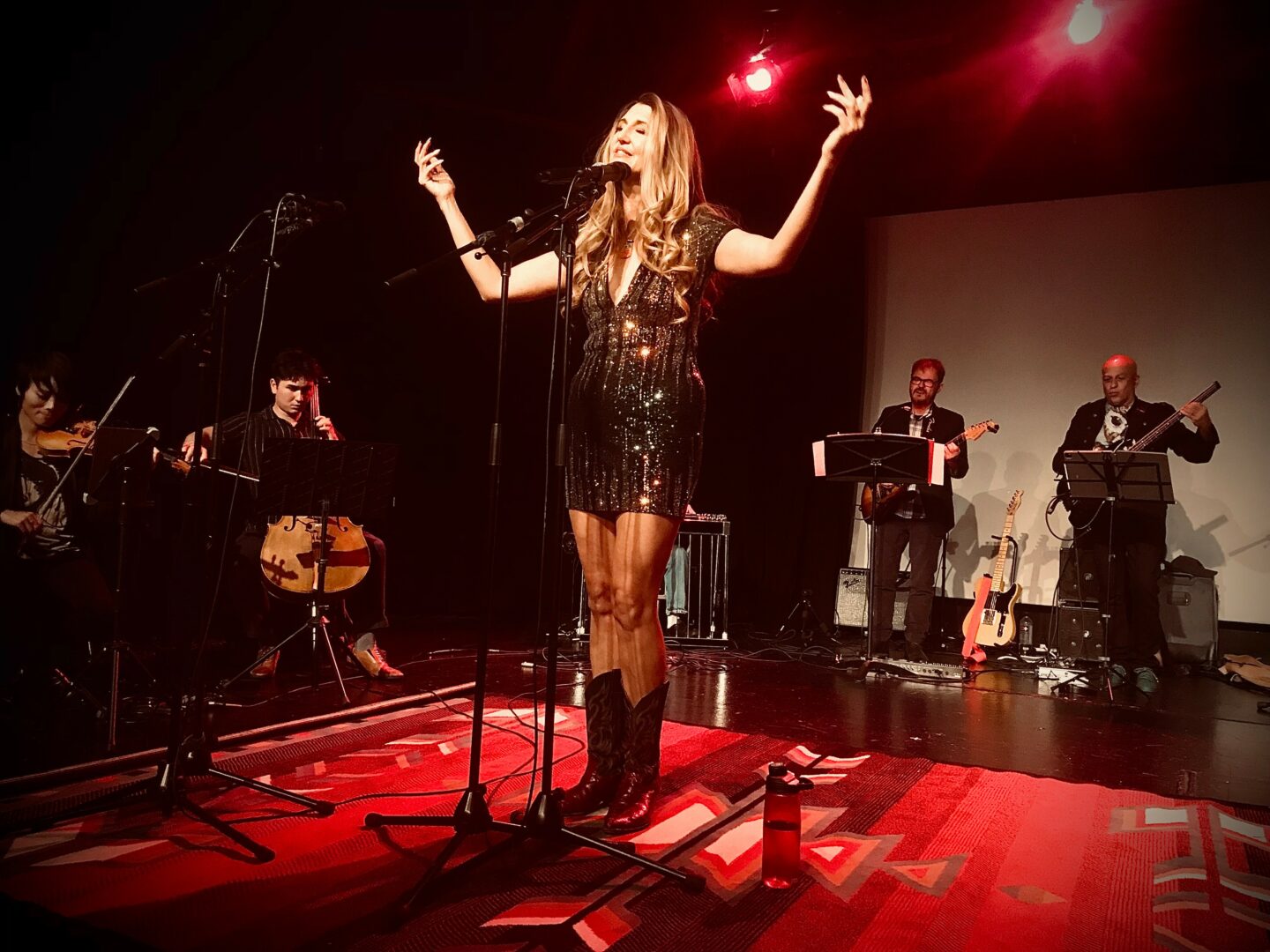 Image standing on the stage at aviator nation with the Rocky Mountain Orchestra in a long black dress.