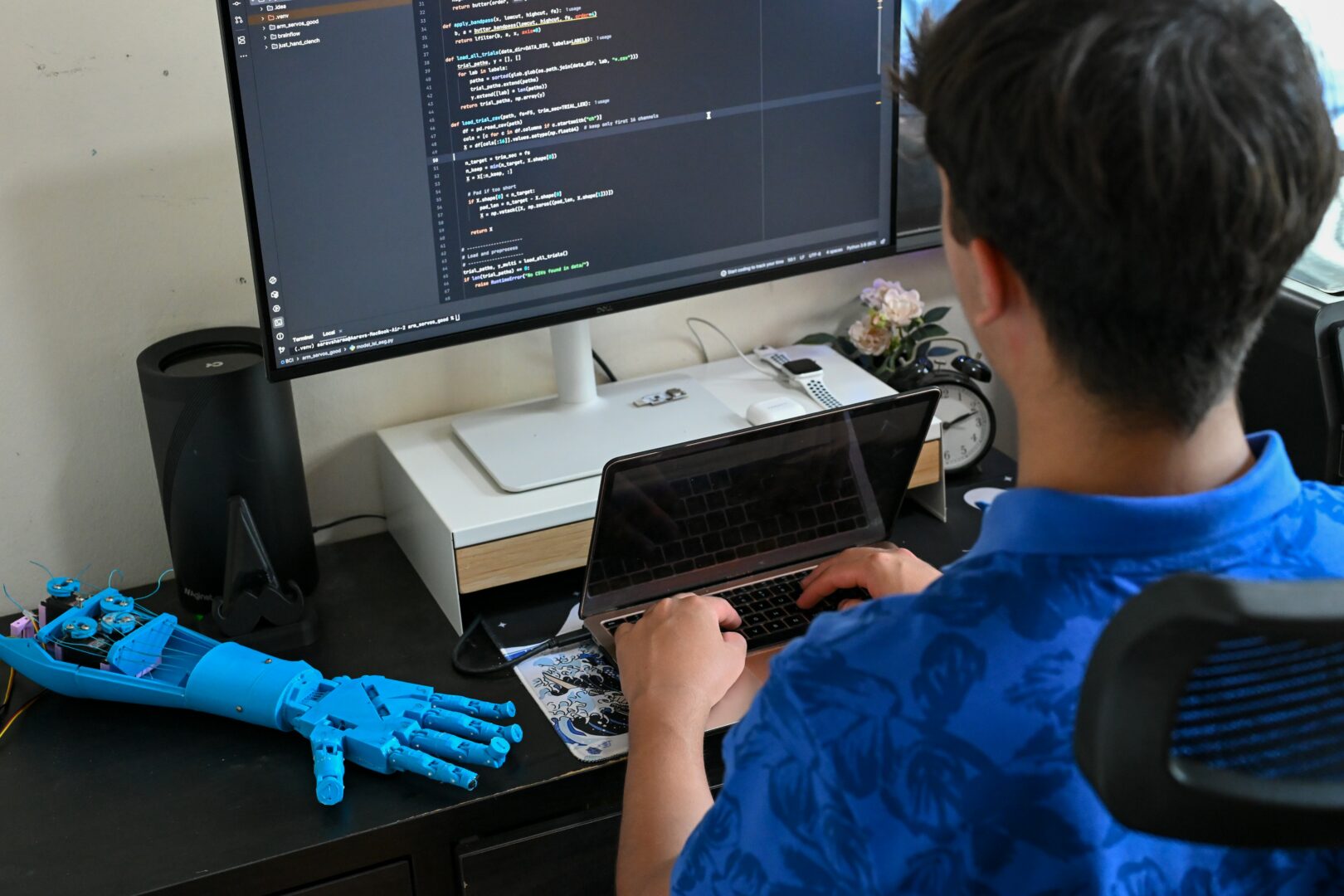 Then I began developing the exoskeleton arm, which was completely 3D printed and self-made. This was an extremely long process as it required me to use CAD to design the 3D models in Autodesk Fusion 360. I created my first working prototype of the exoskeleton arm, and early results were impressive since users were able to control it directly through their thoughts. The system runs on a supervised machine learning method called logistic regression, which is well-suited for binary states such as clenched or relaxed. By training the model with large amounts of EEG data, it can output real-time signals to move the arm. Since the design has 5 degrees of freedom, it is quite robust, allowing fine motor control of the fingers. With these milestones, I was able to prove that technology, when applied thoughtfully, can truly restore lost abilities and improve lives.