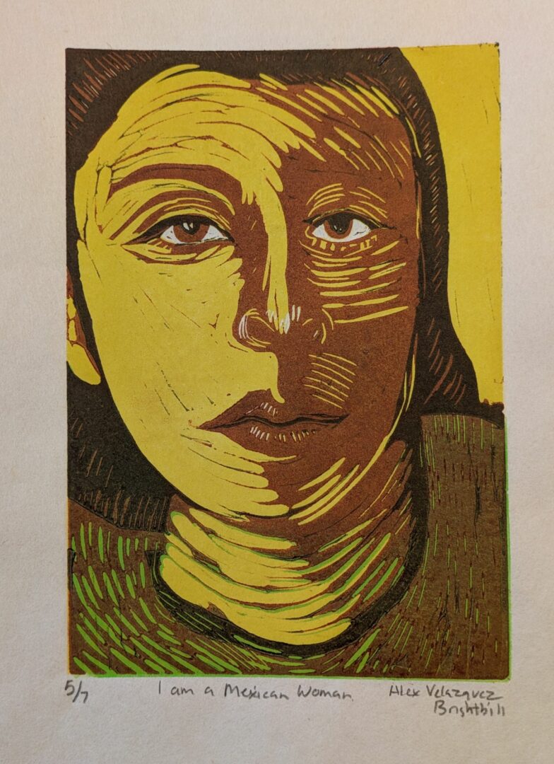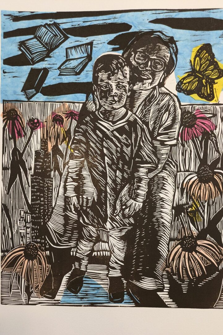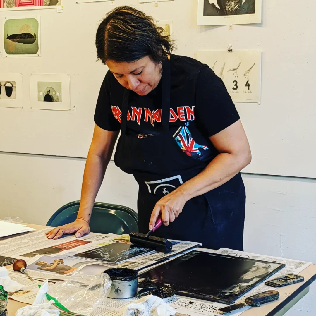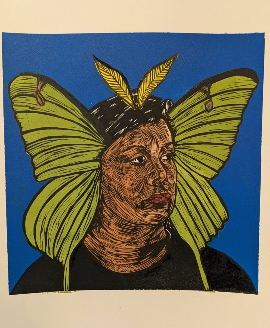 Right now, my work focuses on printmaking as a way to tell stories, both my own and those of my community. Through printmaking, I hope to spread positivity, hope, and healing. Self-portraits are central in my current exploration, as I use my own likeness to dive into themes of identity, memory, transformation, and personal healing.