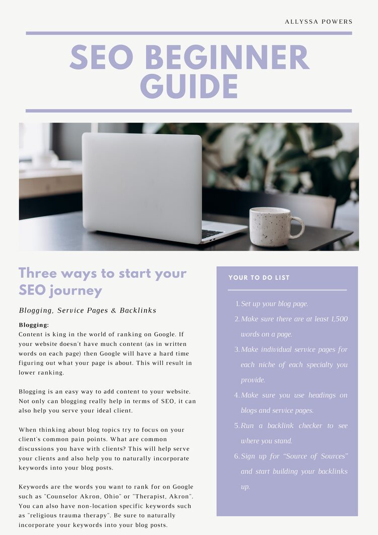 I am a therapist, business coach, and educator. My main focus is my continuing education company, Allyssa Powers LLC, where I create business-focused continuing education courses specifically for therapists. My goal is to fill the gaps in our training around business ownership and private practice management. The heart behind my work is simple: “You were trained as a therapist, not a business owner—our continuing education changes that.”