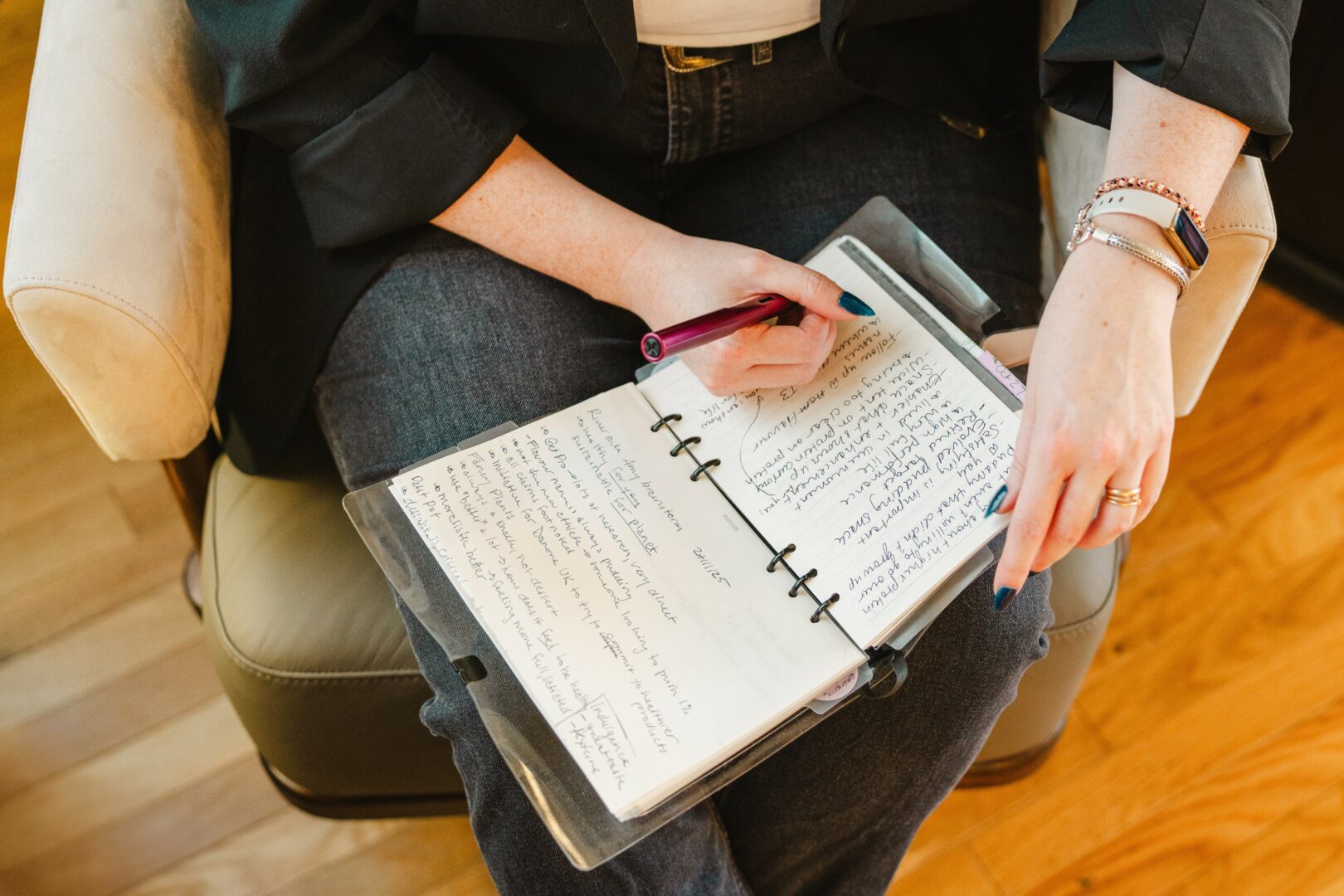 The other piece of advice I have is to get it out of your head and out of your body. There is a great quote from David Allen, “Your brain is for having ideas, not storing them.” It’s much easier to get stuck in the mental swirl if I’m not writing regularly, especially writing by hand. It is helpful to slow my thoughts down to the pace of my hand, even if I get impatient with it. When I am in a regular notetaking process, everything else seems to flow with more ease. I will also say, we are taught to be very still as civilized grownups. Move your body, shake it out, especially if you’re experiencing something stressful or activating. We are animals, after all, though we might forget. It doesn’t have to be a big deal — just shake out your hands, or put on music and dance, maybe do some arm circles, roll out your neck. Give yourself a chance to MOVE so the overwhelm doesn’t get stuck and calcified within you.