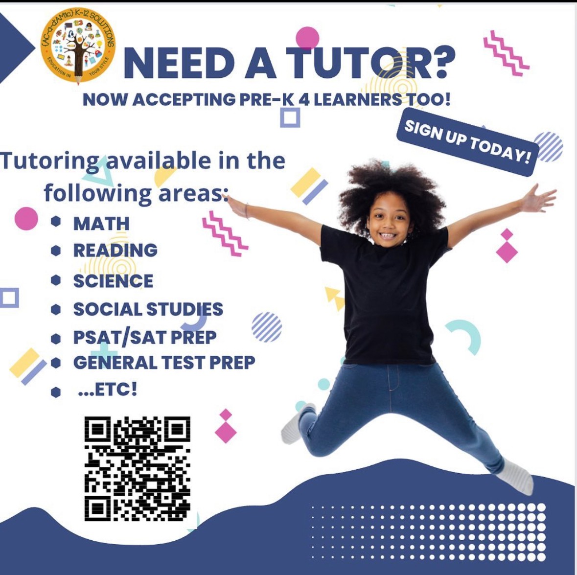 I have always had a passion for education, which led me to start my own mobile tutoring company called Acadamic K-12 Tutoring (now Acadamic K-12 Solutions) in 2015. I would travel to different homes within the DMV area to provide in-person tutoring for students in grades K-12. Over the years, my company has expanded to offer virtual services, homeschool support, professional development, and summer camps. Our latest endeavor is an After School program that follows the same philosophy as my company.