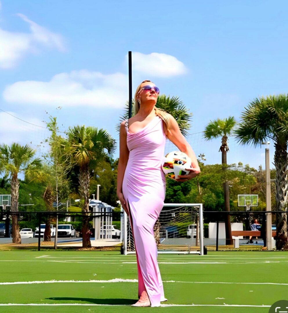 Versace Pink Dress and Sun on a soccer pitch in Miami by Photographer Giano Currie