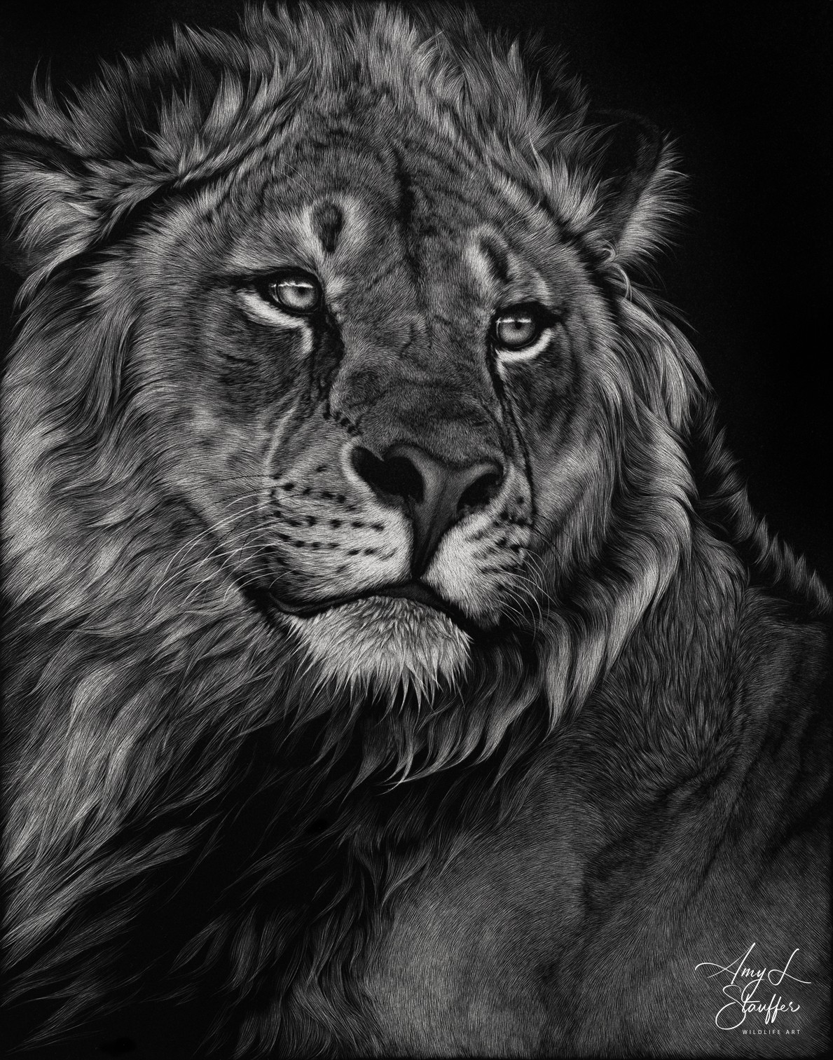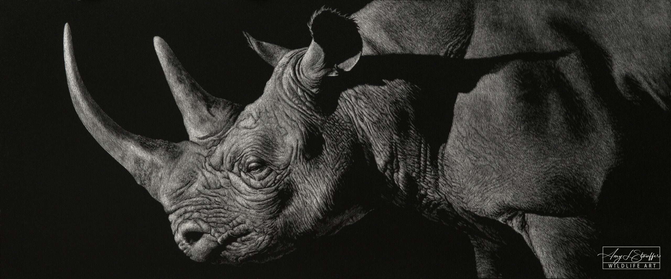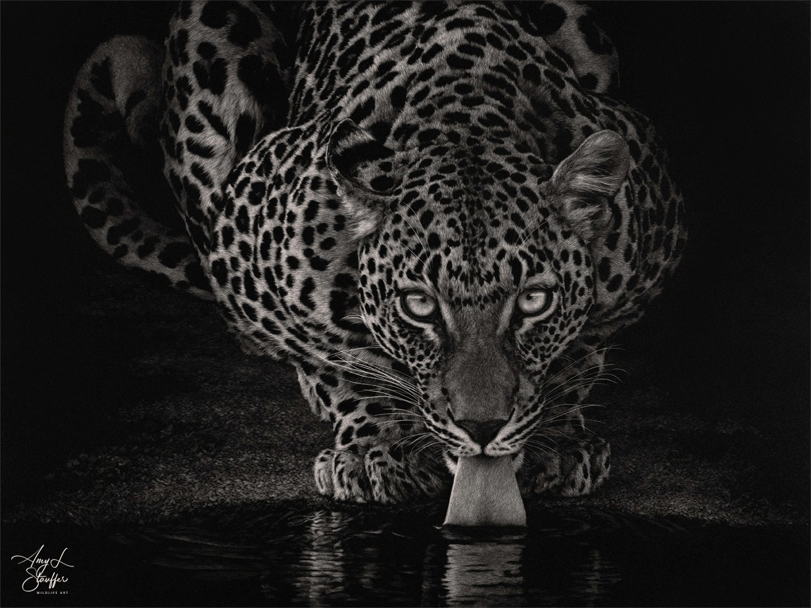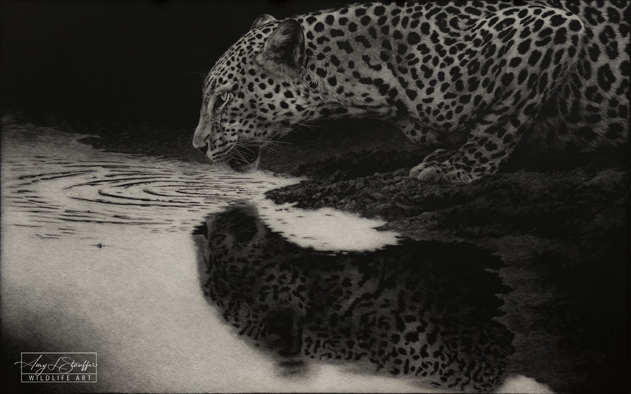 While life did not ultimately lead me to the lab I will never stop being a scientist at heart and it has been remarked that I approach my work with the patience of a scientist. Some might say the arts and science are opposing fields of study, but I believe that view to be shortsighted. Both are driven by passion and a desire to understand. Without art, science is only theory, and without science, art is only emotion. Together, they help capture the full breadth of the world and as so many of my colleagues in the wildlife art community can attest, one naturally flows into the other. As I’ve spent so much of my life studying animals, I’m driven to share their stories. What does it mean to be a leopard that has to kill to make its living, and what does it mean to be an elephant who’s witnessed the decimation caused by human poaching? My art, rendered using the meticulous medium of scratchboard in simple black and white, attempts to portray every species with the same sensitivity usually reserved for human subjects. I hope to inspire people to meet these creatures where they are, for who they are, as unique individuals with their own stories to tell. Their struggle to survive, protect their homes, and care for their young is a journey shared by us all. If I can inspire you to see in another animal’s eyes a kinship and a shared experience, then I have done my job.