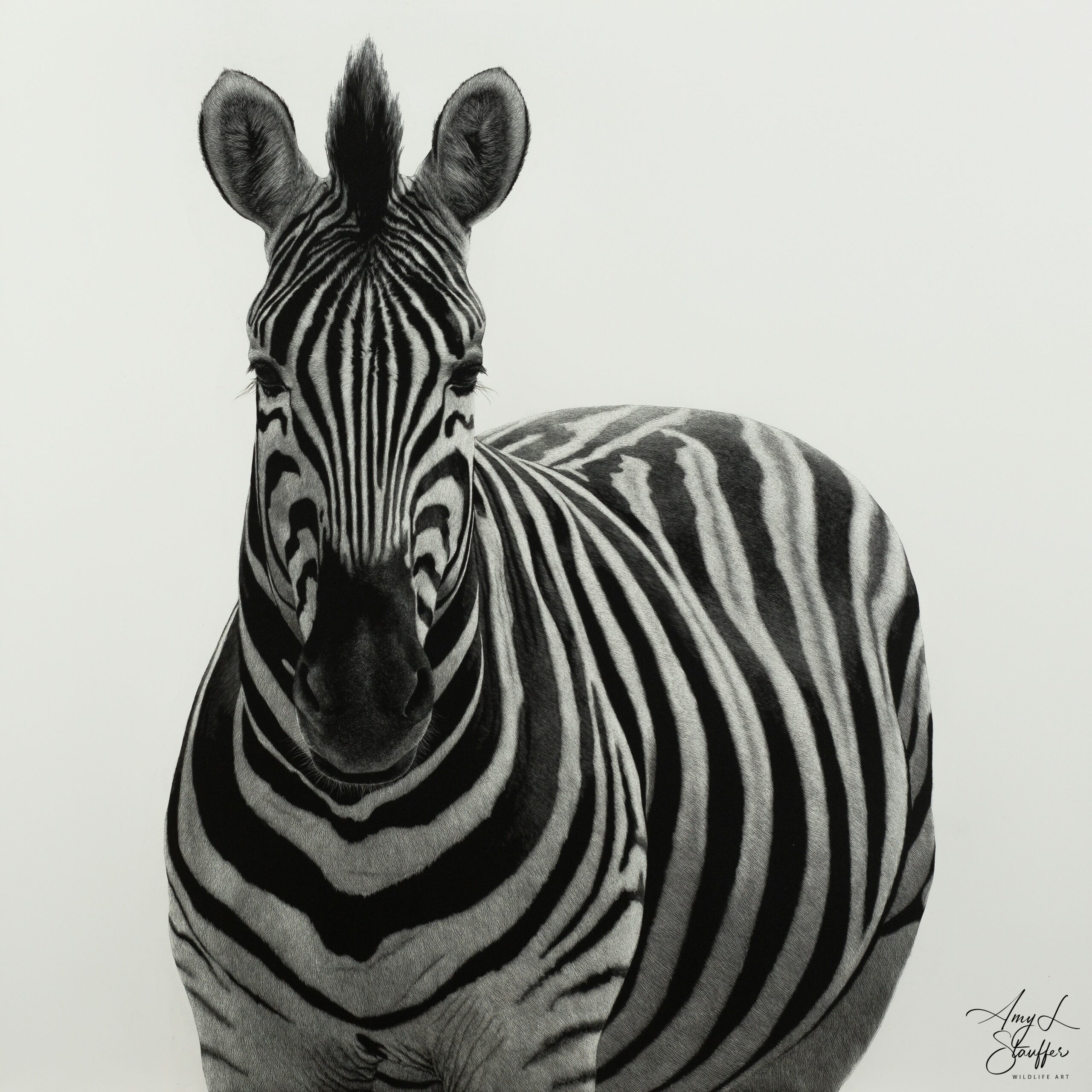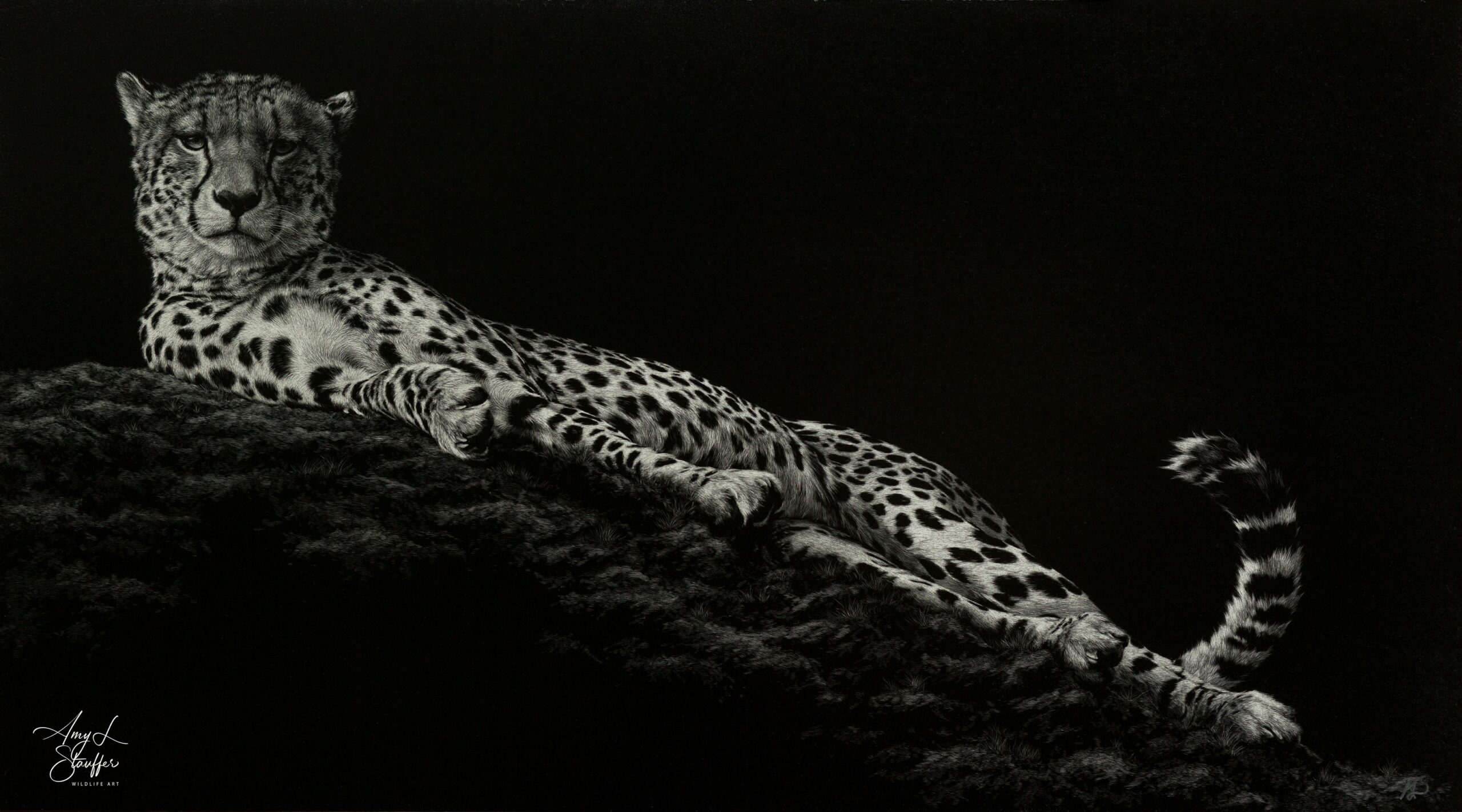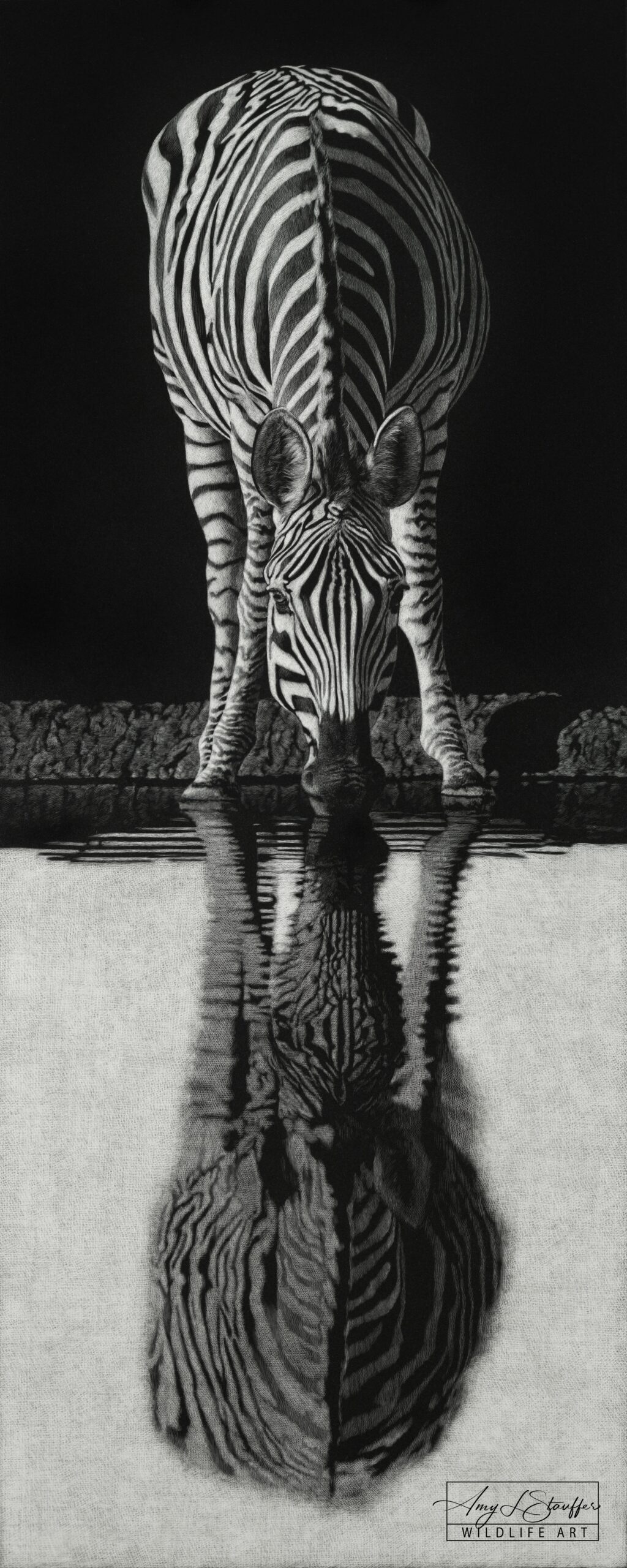 While life did not ultimately lead me to the lab I will never stop being a scientist at heart and it has been remarked that I approach my work with the patience of a scientist. Some might say the arts and science are opposing fields of study, but I believe that view to be shortsighted. Both are driven by passion and a desire to understand. Without art, science is only theory, and without science, art is only emotion. Together, they help capture the full breadth of the world and as so many of my colleagues in the wildlife art community can attest, one naturally flows into the other. As I’ve spent so much of my life studying animals, I’m driven to share their stories. What does it mean to be a leopard that has to kill to make its living, and what does it mean to be an elephant who’s witnessed the decimation caused by human poaching? My art, rendered using the meticulous medium of scratchboard in simple black and white, attempts to portray every species with the same sensitivity usually reserved for human subjects. I hope to inspire people to meet these creatures where they are, for who they are, as unique individuals with their own stories to tell. Their struggle to survive, protect their homes, and care for their young is a journey shared by us all. If I can inspire you to see in another animal’s eyes a kinship and a shared experience, then I have done my job.