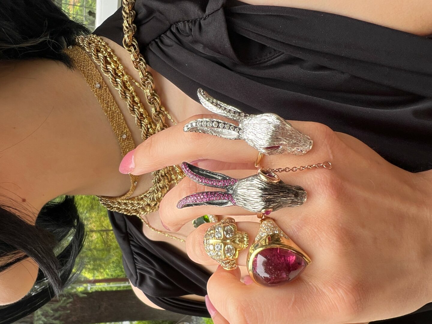 My husband, Mike, is a gemologist, and together we source diamonds and rare gemstones to complement the designs. For me, the magic lies in balancing that vision with the materials themselves—melding imagination, carving, and stones into something that feels alive.