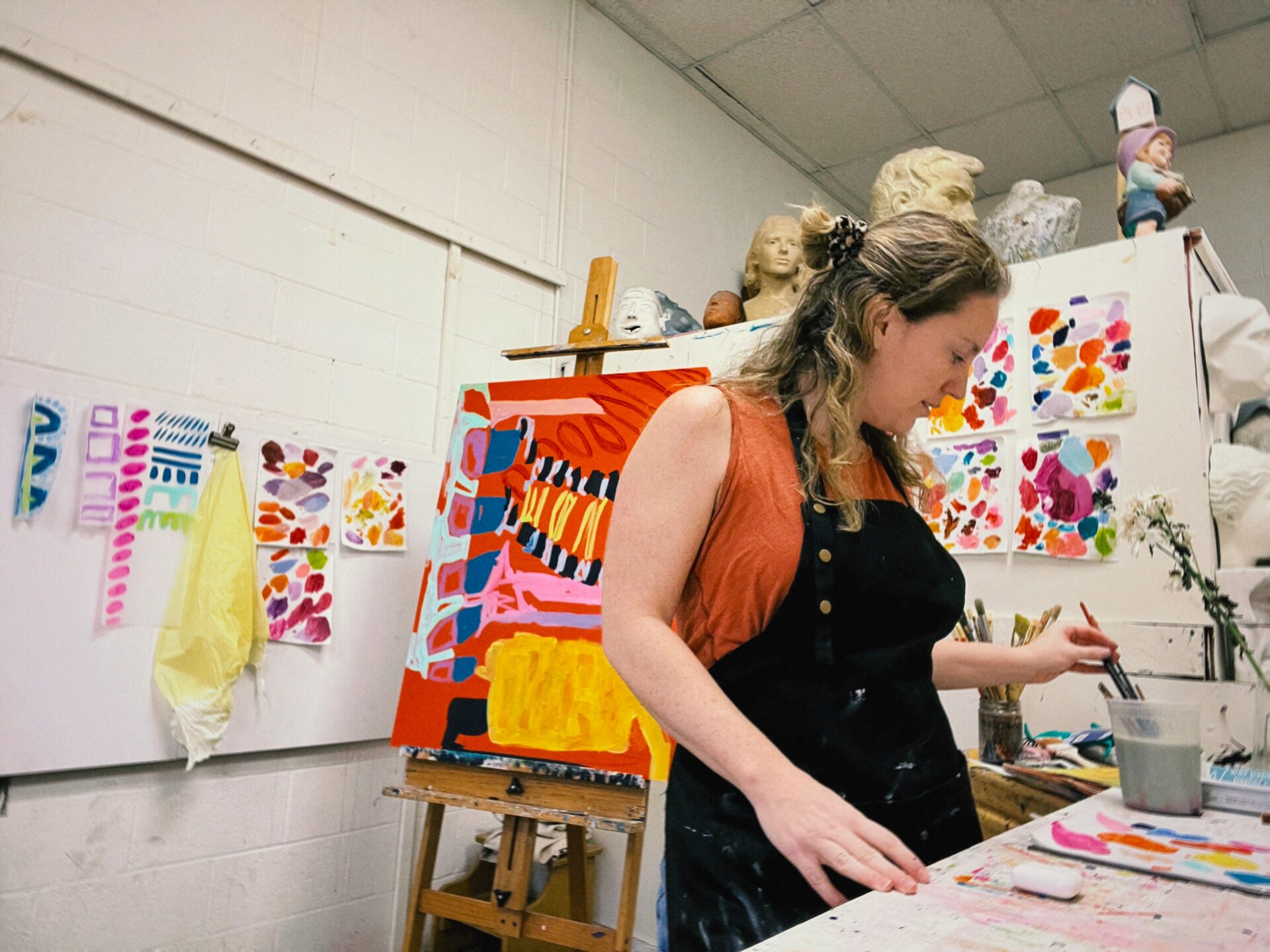 I’m an abstract painter and mixed media artist based in Macon, GA. My art keeps evolving every year, this past year I have been exploring the meaning of objects and how they can be used and transformed to express different ideas. I have been really drawn to elevating aspects of life that often go overlooked or unnoticed. One of my most recent exhibitions focused on my experience of being an administrative assistant for 10 years. By using office supplies, products associated with femininity, and transparent materials, I explored how that role in an office is often overlooked, almost always a female, and the dated expectations that position carries.