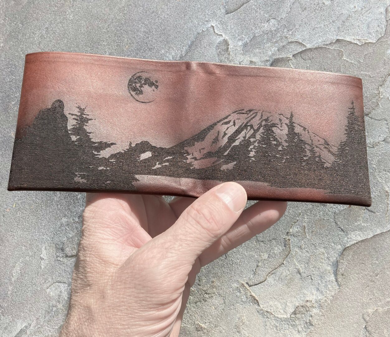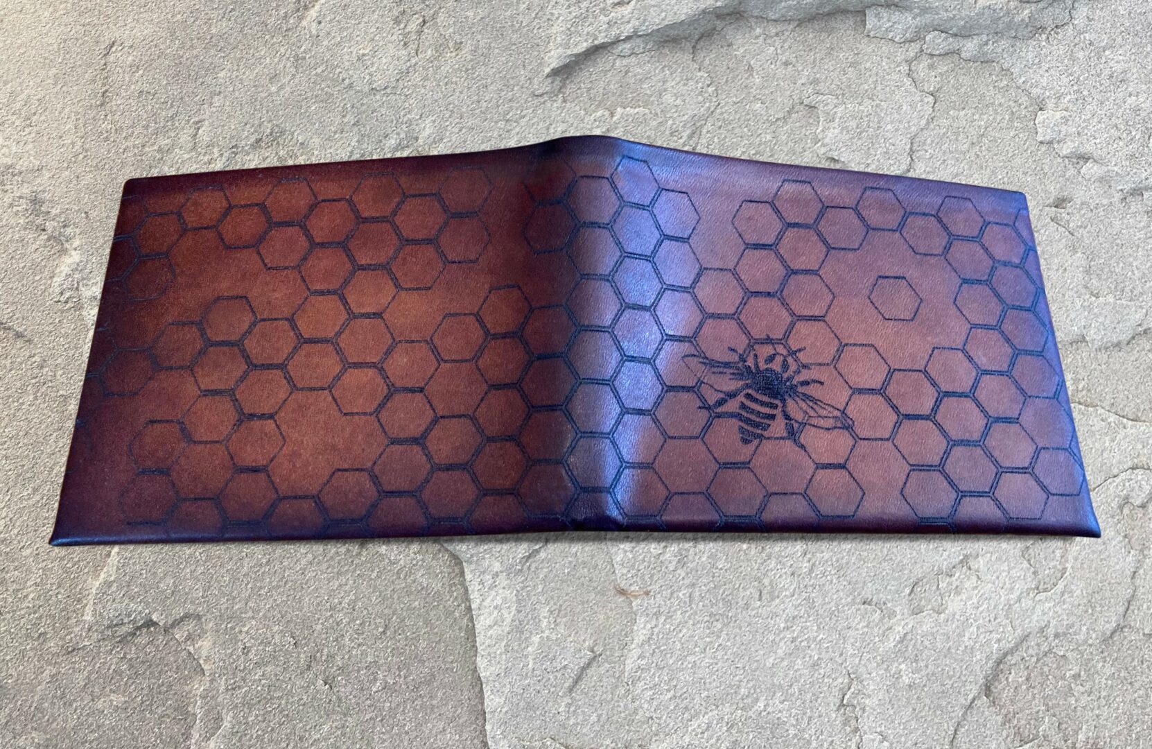 The ForeverFold bifold and our card carriers are each folded from a single piece of leather with no seams or stitching. This makes a uniquely wonderful portable canvas because lasered art can wrap, front to back, around each and every surface of the wallet.