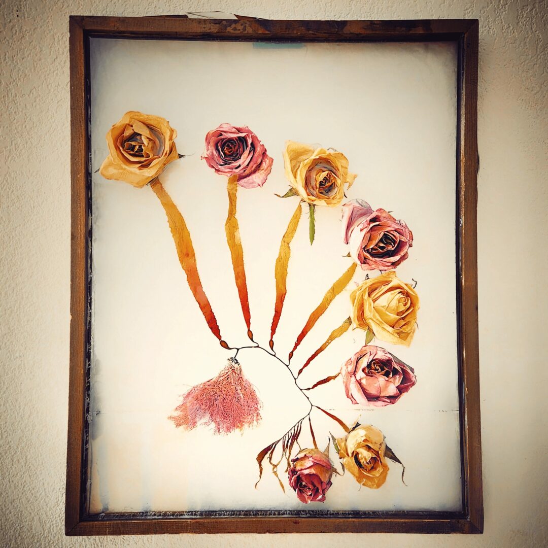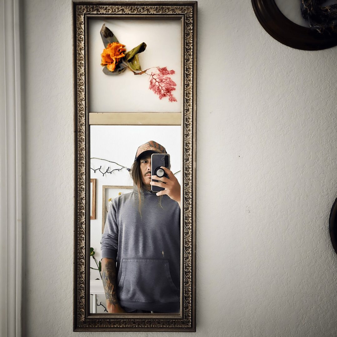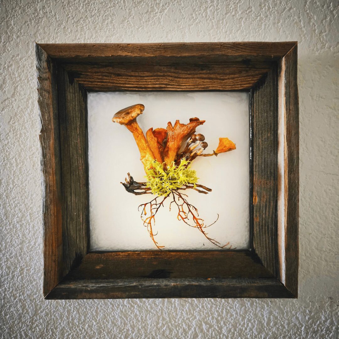 I started to combine these together and then everything clicked! It started simply as adding leaf-shaped kelp to a sunflower, and evolved to complex designs of kelp, flowers and even fungi; inspired by my neuroscience background, climbing trips in the Sierras, surf missions down in Baja, and relationships with those I love. I then epoxy resin all of this directly into a picture frame to create sculptural, hangable art.