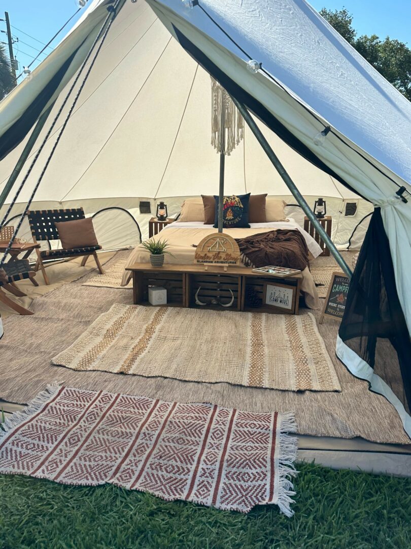 Under the Stars Glamping Adventures is a mobile glamping company that brings the fun and adventure to you! Our company is special because we offer such a variety of luxury services for every occasion. Whether it’s a baby shower or a first birthday, Sweet 16 or a wedding, we have something unique and fun to add to your celebrations. One of our most unique set ups is our village. Our “pop-up hotel” is great for weekend weddings, retreats, reunions, and more. Guests can stay together and enjoy the outdoors while having all the luxuries of a hotel room. With queen foam mattresses on custom wooden bed frames, table and chair sets, luggage racks, crates, and lanterns, guests will feel comfortable and cozy . Our glamping adventures can provide lounge tents, movie nights, picnics and more! We promise that whatever adventure you choose, we strive to exceed your expectations and provide you an unforgettable experience!
