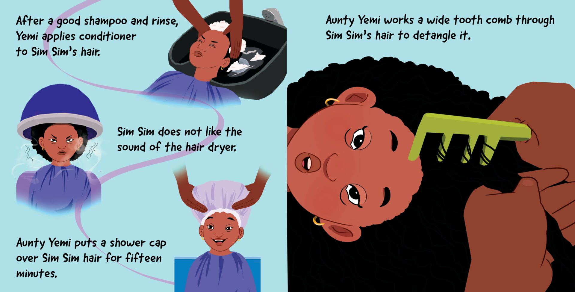 I currently have two children’s books that I illustrated, Sim Sim Goes to the Salon and I Don’t Like the Birthday Song, both published a few months ago. I’m very proud to have worked on projects that shed more light on children with special needs, and I look forward to doing even more of this in the future.