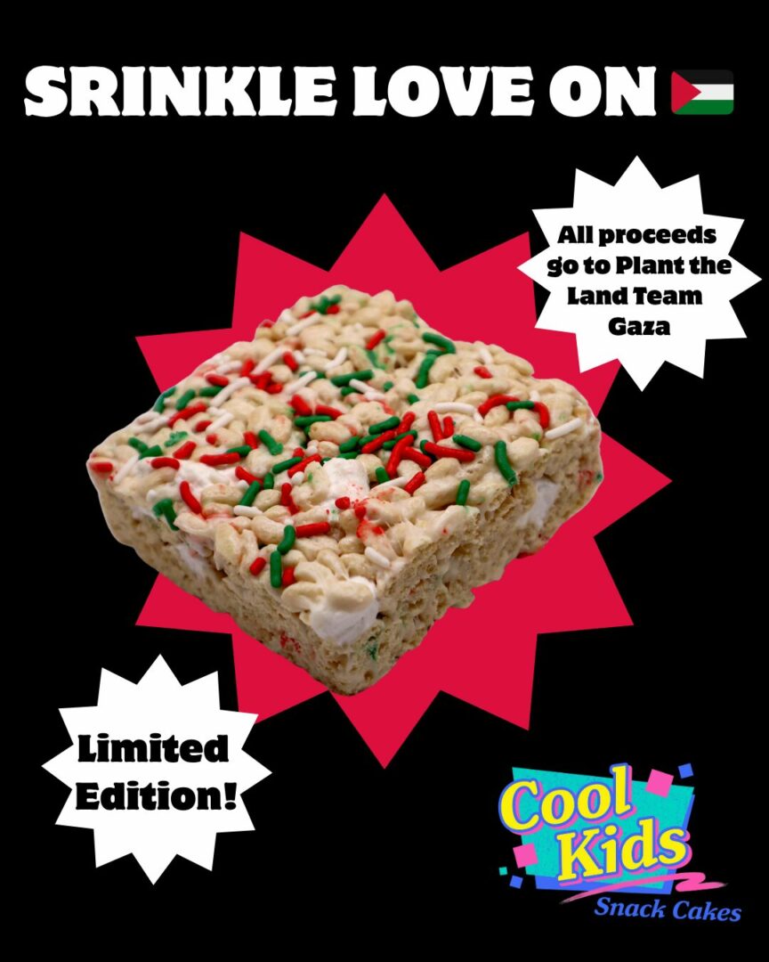And at Cool Kids Snacks Cakes, we’re raising funds for humanitarian aid in Palestine through our limited edition Counter Crispy, “Sprinkle Love on 🇵🇸”. All proceeds from this delicious Crispy (tastes like birthday cake) go to Plant the Land, a small Vegan mutual aid group in Gaza.