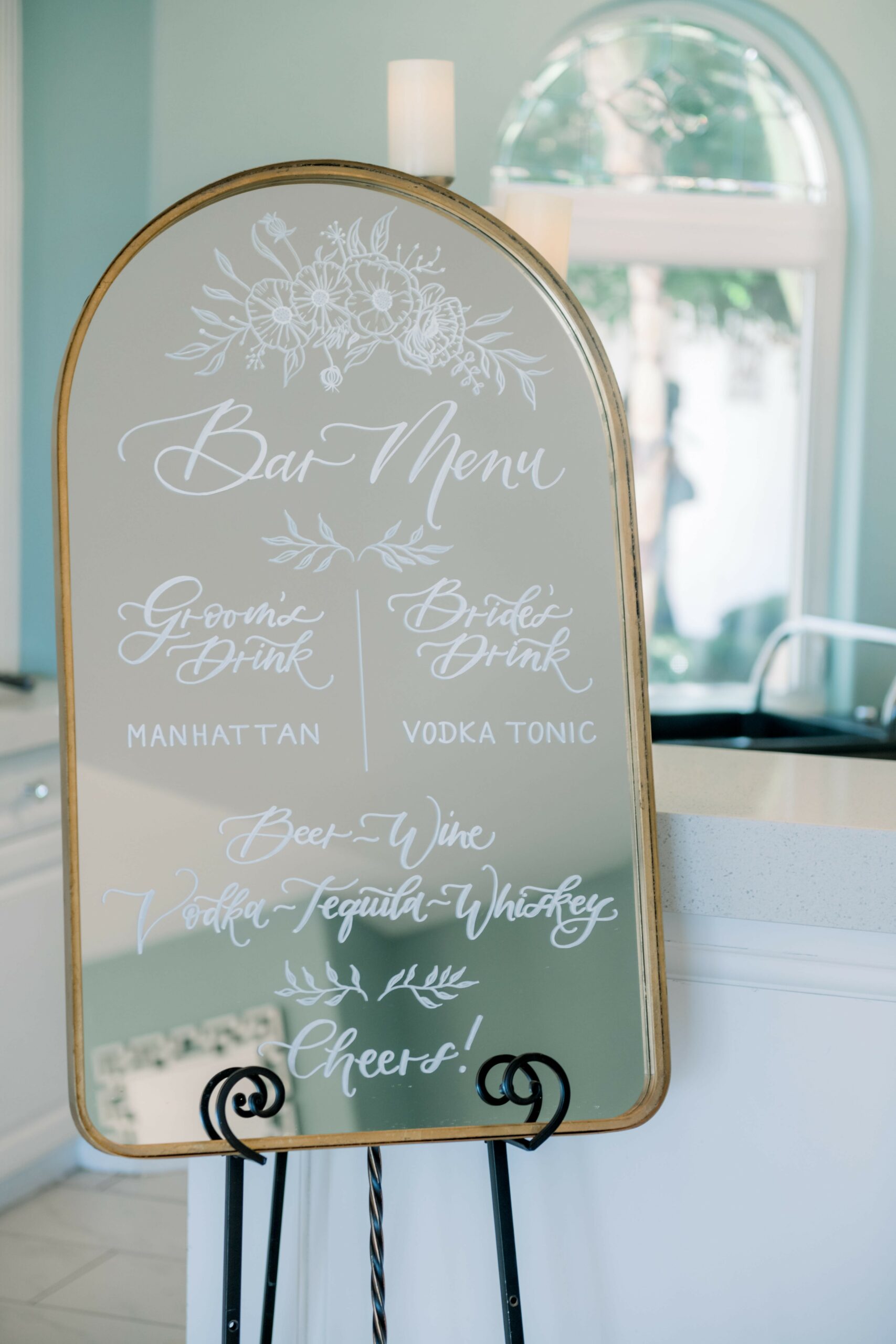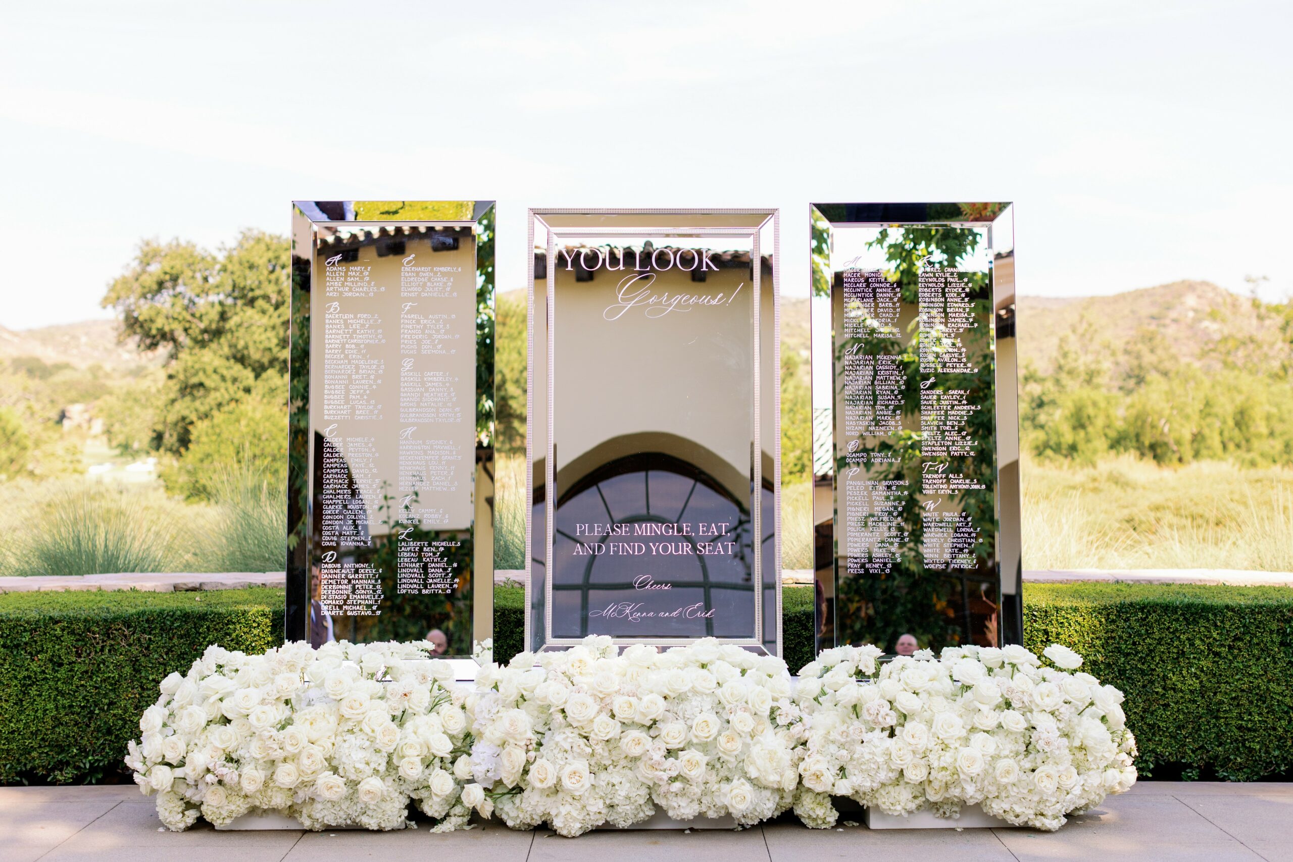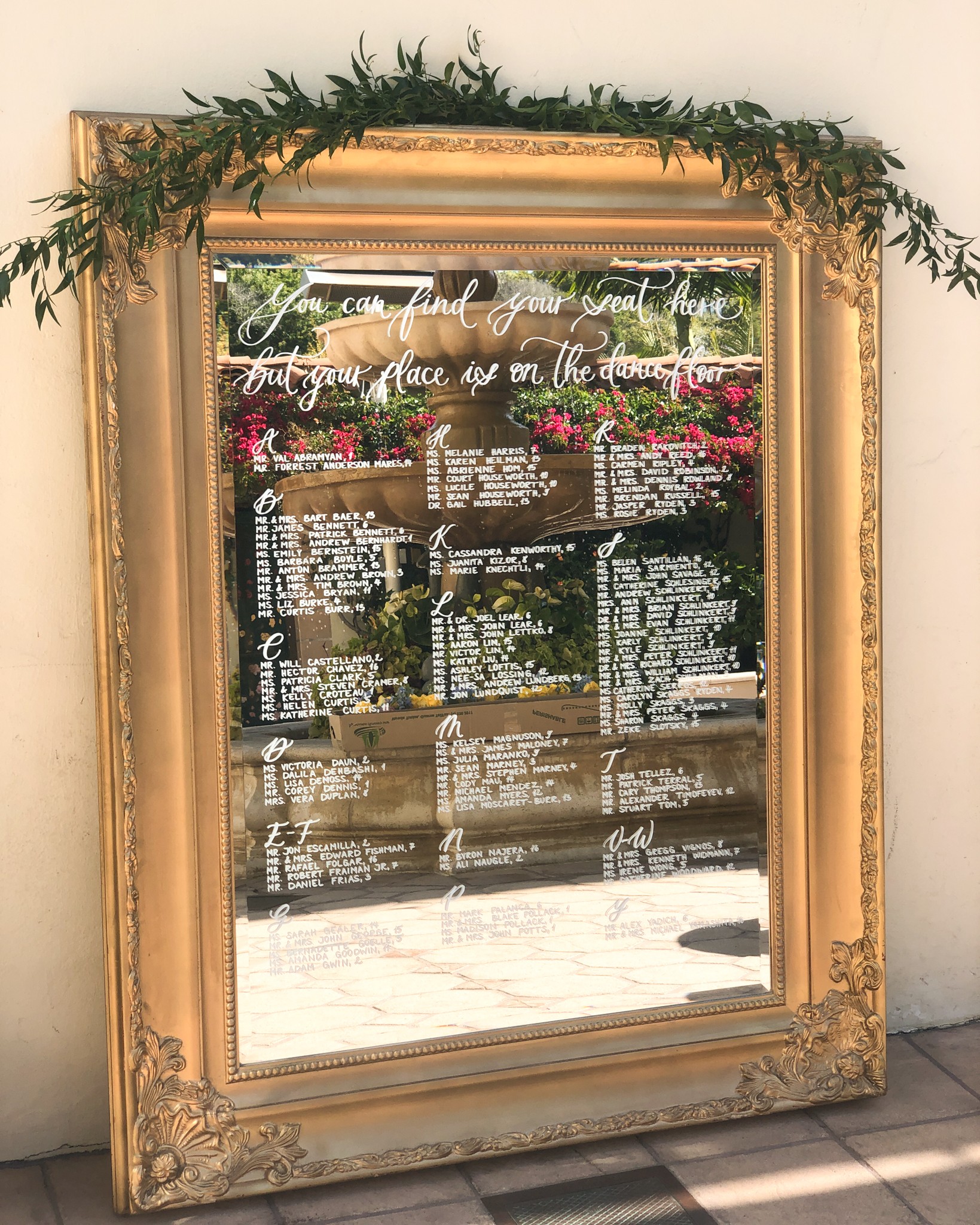 For wedding clients, I specialize in custom mirror signage and have a mirror rental collection that I deliver all over Los Angeles, Ventura and Orange County; and even as far as Riverside and Santa Barbara County. Most of my rentals are unique vintage pieces that are the perfect addition to elevate any event. I have mirrors in multiple sizes, the biggest one is a 5 by 7 feet floor-length golden mirror that is perfect for a large seating chart for an event with 250+ guests.