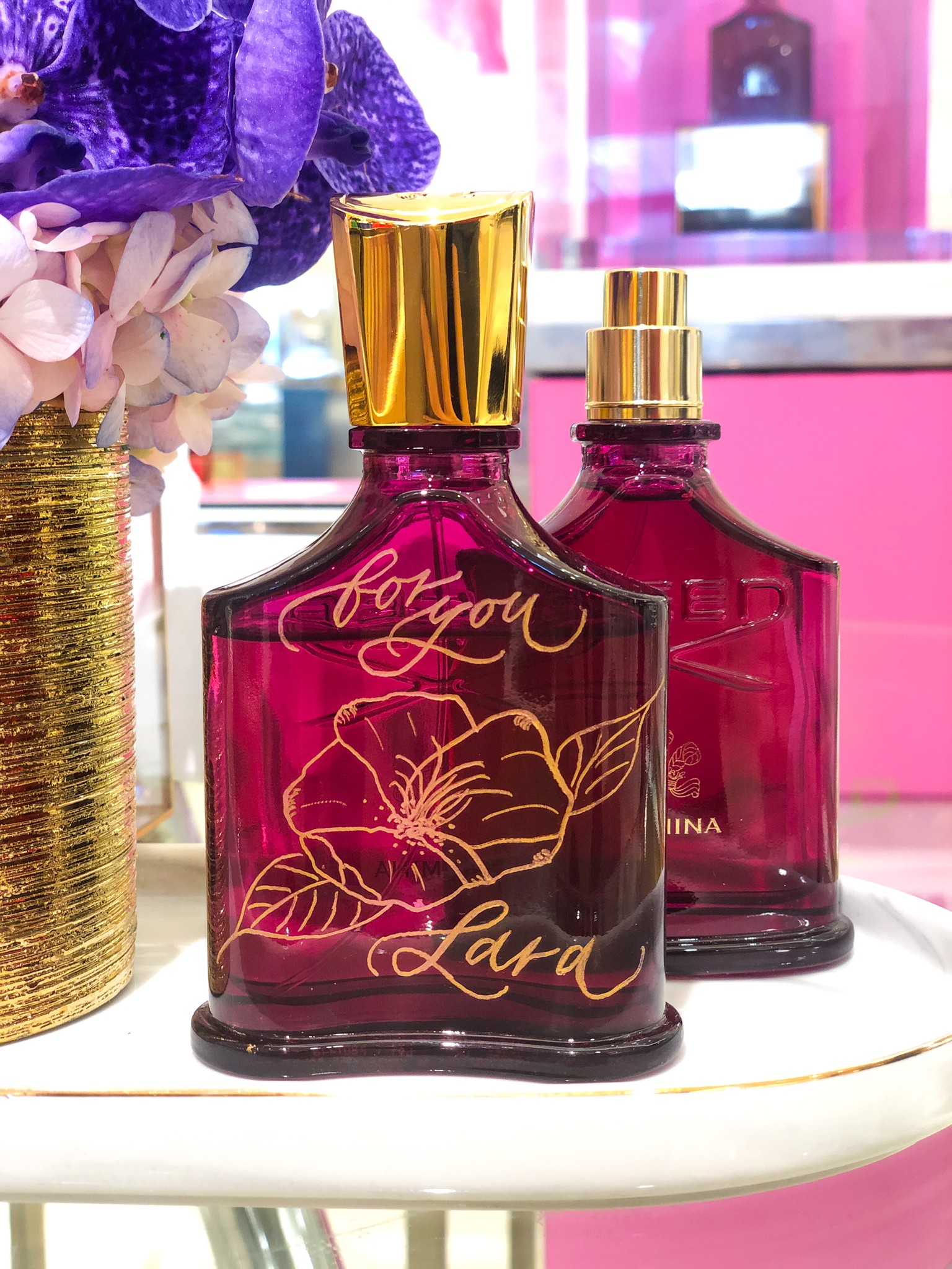 For brand activations and corporate events, I offer live calligraphy and engraving services, as well as bottle painting and hot foiling. I love to work on-site, helping my clients to elevate their brand with a customized keepsake for their patrons. For example, I live engrave or paint on-site on fragrances or other items such as candles and liquor bottles.