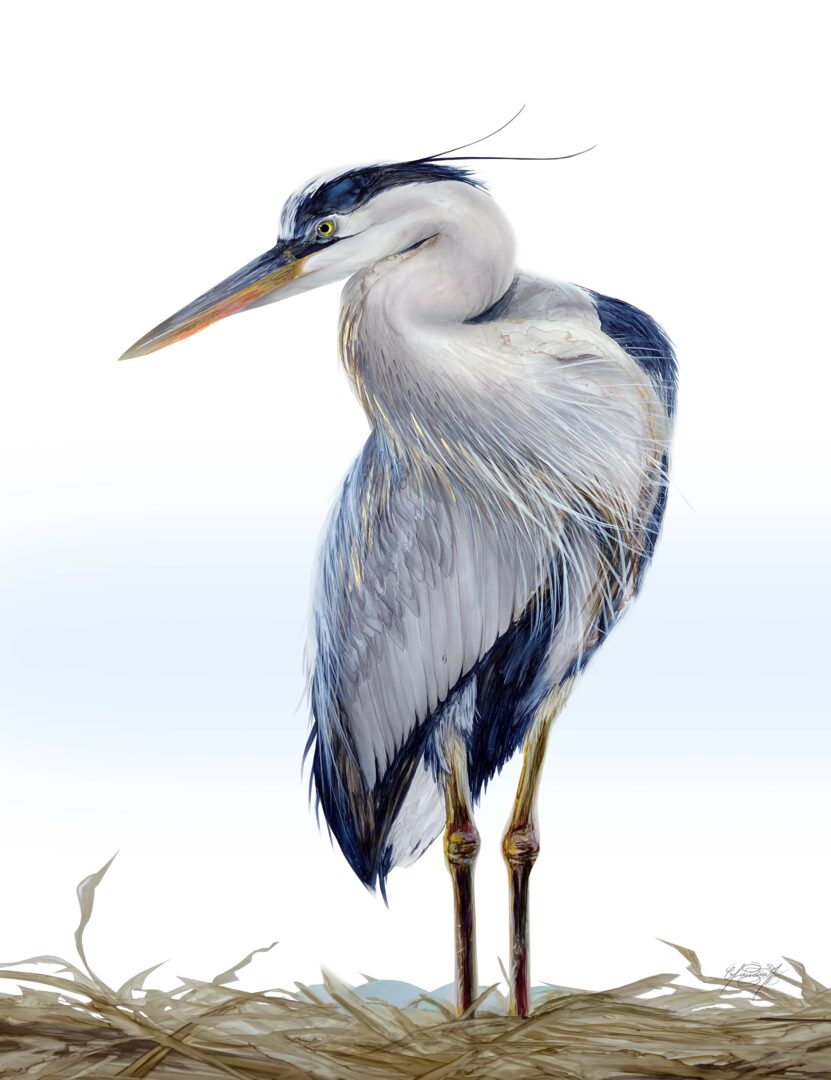 3. “Gentle Keeper” 24X30″ (Blue Gray Heron with four eggs on a nest by Claudia E. Benton)