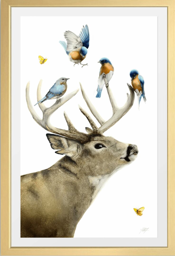 I placed a single female eastern bluebird on the antlers, feeling that a quiet but strong female presence belonged there. The composition balanced with two yellow butterflies, creating a moment of harmony. When the painting was complete, I thought its meaning was clear to me—but I later learned that it carried something even deeper for someone else.After the painting was released, at the art festival, someone connected to it in a way I never expected. They shared a deep personal story that aligned in an extraordinary way-one involving all the subjects of this piece, coincidentally mirroring exactly what I had painted with what they represented to me. The connection between was something neither of us could have planned, but it became one of the most profound moments of my career.
