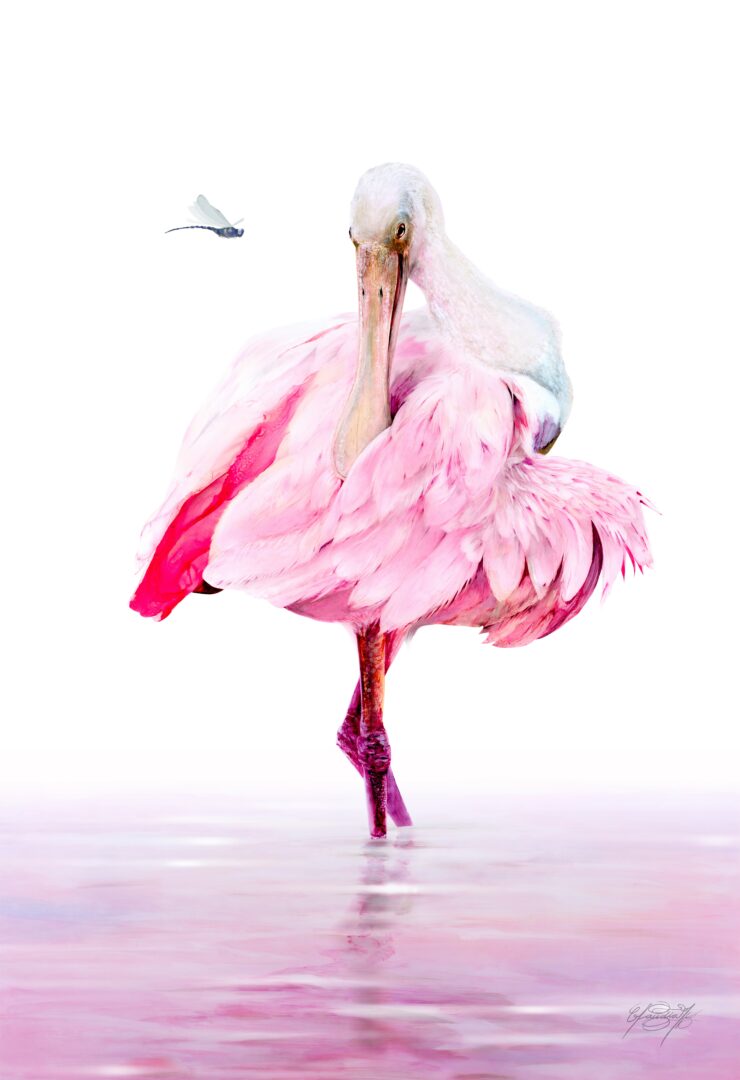6. “Pretty in Pink” 32X45″ (Spoonbill Roseate with a blue dragonfly by Claudia E. Benton)