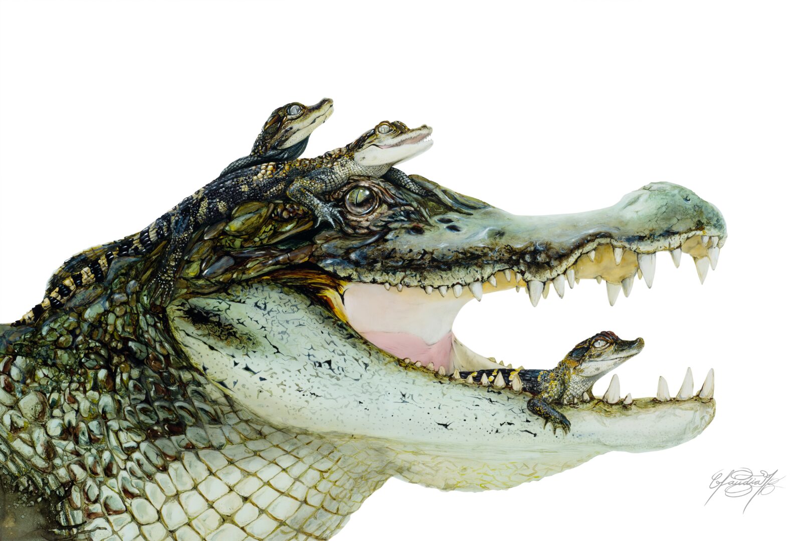 1. “Motherhood” 24X30″ (Female American alligator with two hatchlings by Claudia E. Benton)