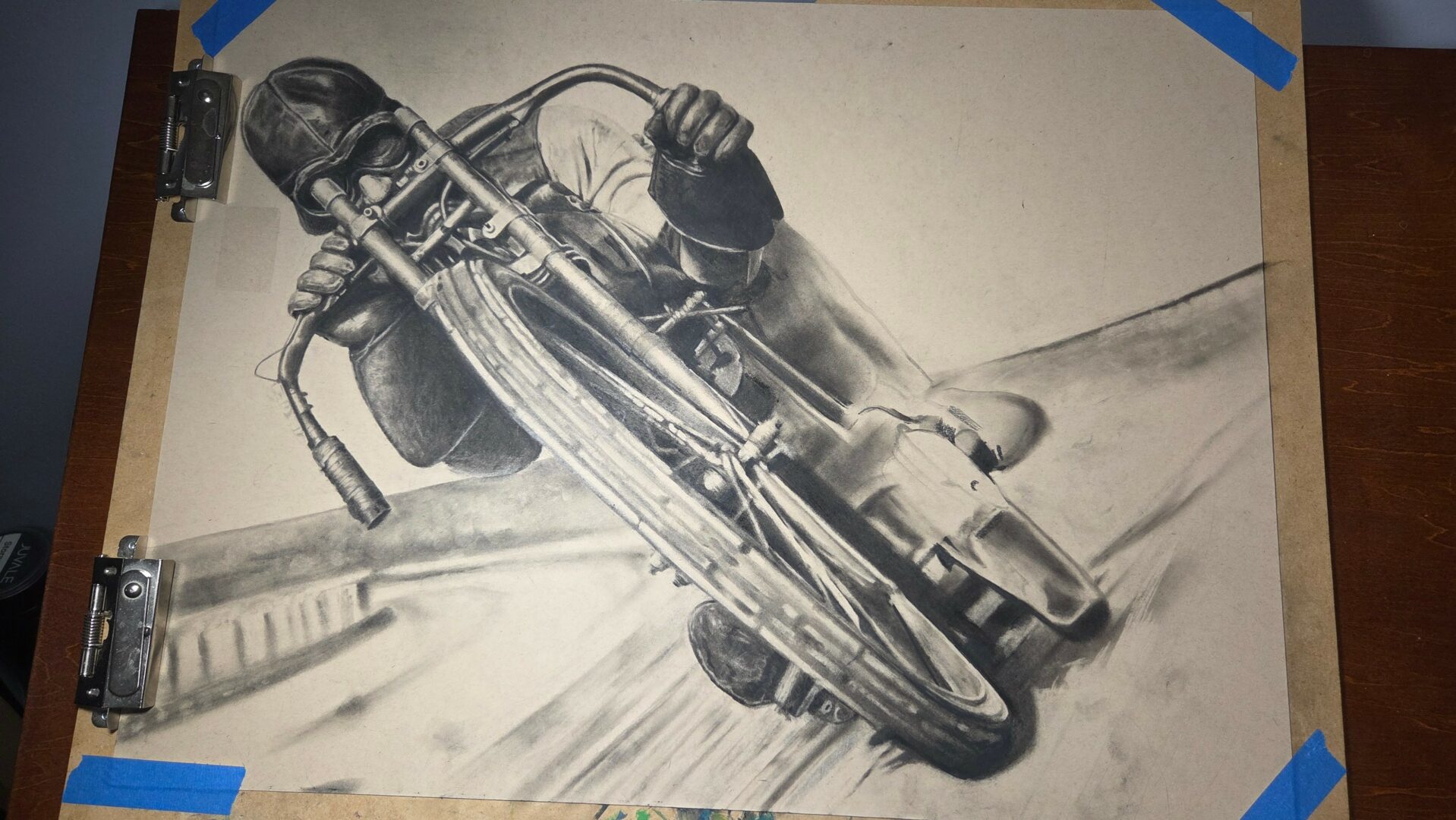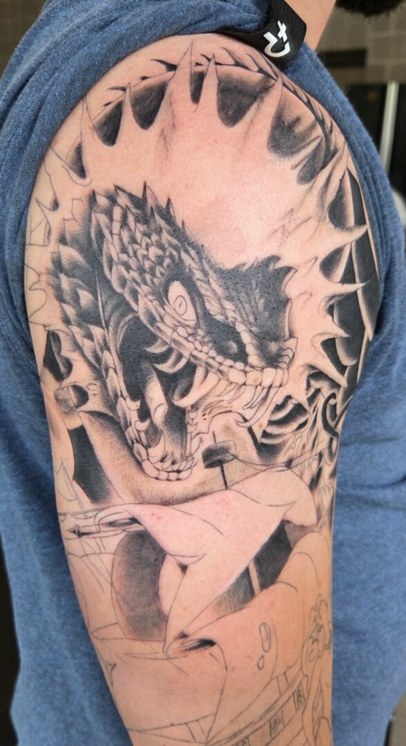 Currently, I’m working on finishing up a charcoal drawing I’ve been working on for years. It’s one of my most ambitious and largest charcoal pieces I’ve done. I’m so excited to finalize this piece. I’ve also started my first flow concept sleeve. I challenged myself to create a sleeve that was one concept, a battle between a water serpent, a kraken, and the ship caught in between them. I’ve had several concepts I scraped, made my client come in multiple times, and then they went home with nothing.