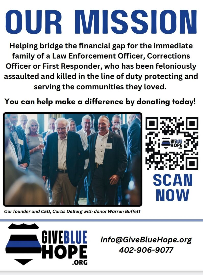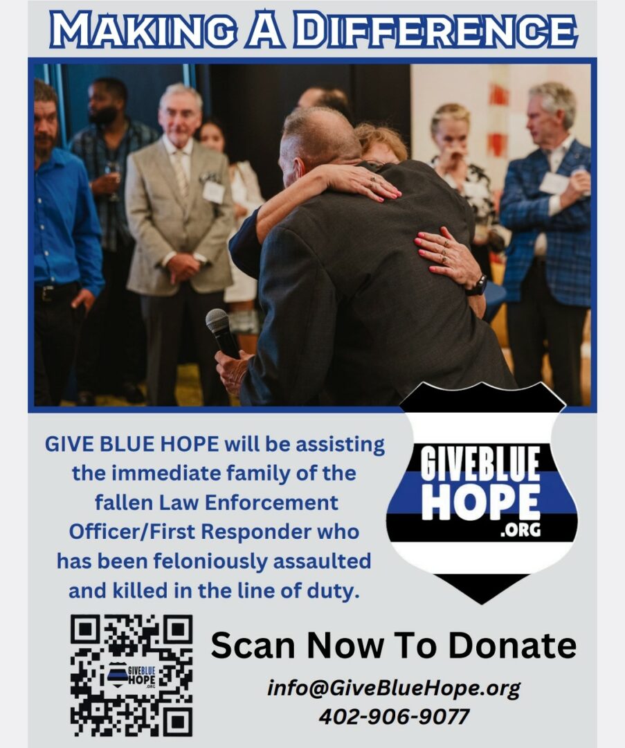 Give Blue Hope is a 501c3 tax exempt non-profit. Our mission is to raise money through the generosity of the people, companies and corporations so we can provide a one-time charitable gift of money to the family of a Law Enforcement Officer, First Responder, Corrections Officer or Security Officer who has been killed in the line of duty.