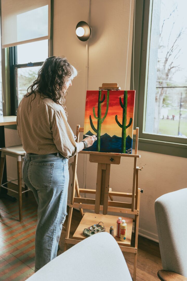 And finally, quirkiness — it’s what makes my classes “me”. I like to keep things fun, laid-back, and full of laughter. Painting can make people feel vulnerable, so I use humor and playfulness to help everyone relax and enjoy themselves. I want every person who comes to a class to leave feeling like they had an amazing night out, not just a painting lesson.