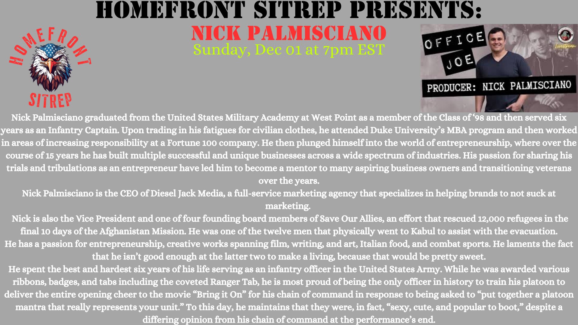 Hello my name is David Willis and I grew up in Bardstown Kentucky. The second child of four for a single mom that had to work two jobs to make it work for us. I knew at a very early age that I would join the military but didn’t know what branch at that time. As I got older and started looking into the different branches I found that the Marines was the best so I have always pushed myself to be the best version of myself so I joined the Marines in 1997 right after high school. after serving six years I got out like most veterans i lost my sense of purpose and sense of community. So I tried to join the Army but was denied for some crazy reason. So I started going down a rabbit hole, so I started to volunteer at veteran nonprofits to fill the void left. after 20 years i left the nonprofit world and started my podcast HomeFront Sitrep. We focus on veteran nonprofits from around the country and we bring in veterans to tell their story as well.