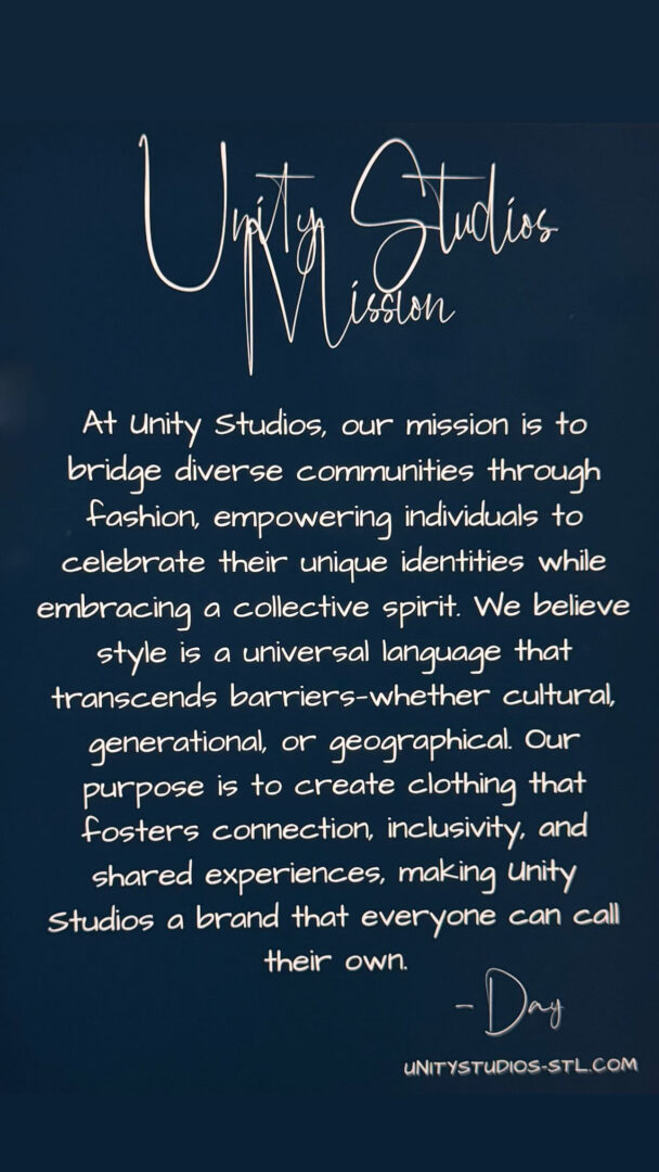 I’m Day Shaw, born and raised in the heart of St. Louis, MO. Growing up, I always knew I wanted to create something that brought people together, and that’s how Unity Studios came to life. My clothing brand is all about individuality, creativity, and connection—using fashion to bridge gaps and promote unity.