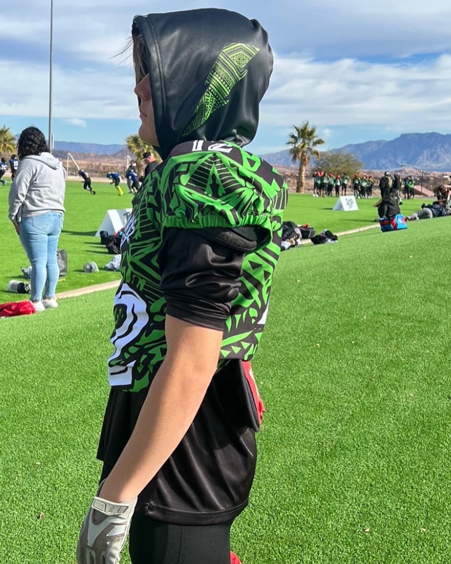 Our hoodies are perfect because it’s lighter than wearing a full hoodie but still uses the best parts of the hoodie. It allows you to custom outfits, it keeps the sun off of your neck, and it’s easy to remove when you are done using it. Athletes love it as well as hoodie lovers. Football players wear them under their pads and soccer players use them to warm up in and simply pull em off without having to remove your jersey when you’re ready to start playing.
