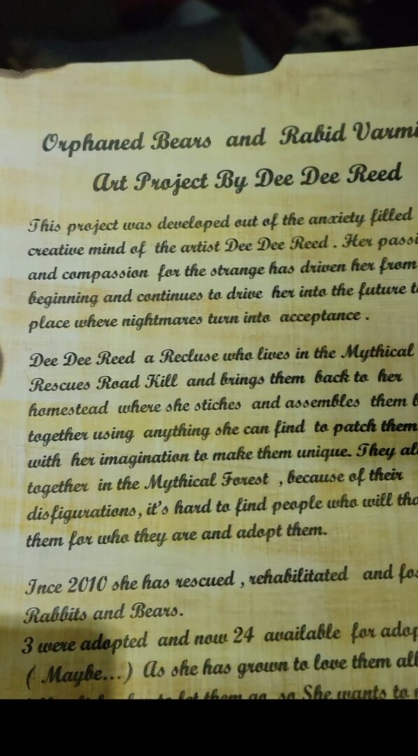 Since I left the professional corporate world I embarked on a new creative venture . I am now the creator of art projects called ” Orphaned Bears & Rabid Varmints” which is based on stories about of each rescued road kill that was turned into a piece of art. Through my art I would like to connect with those who may have felt like they did not fit in and see the beauty in the odd looking creatures that I create.