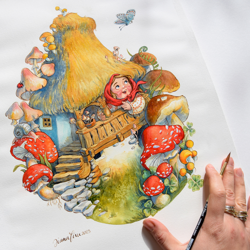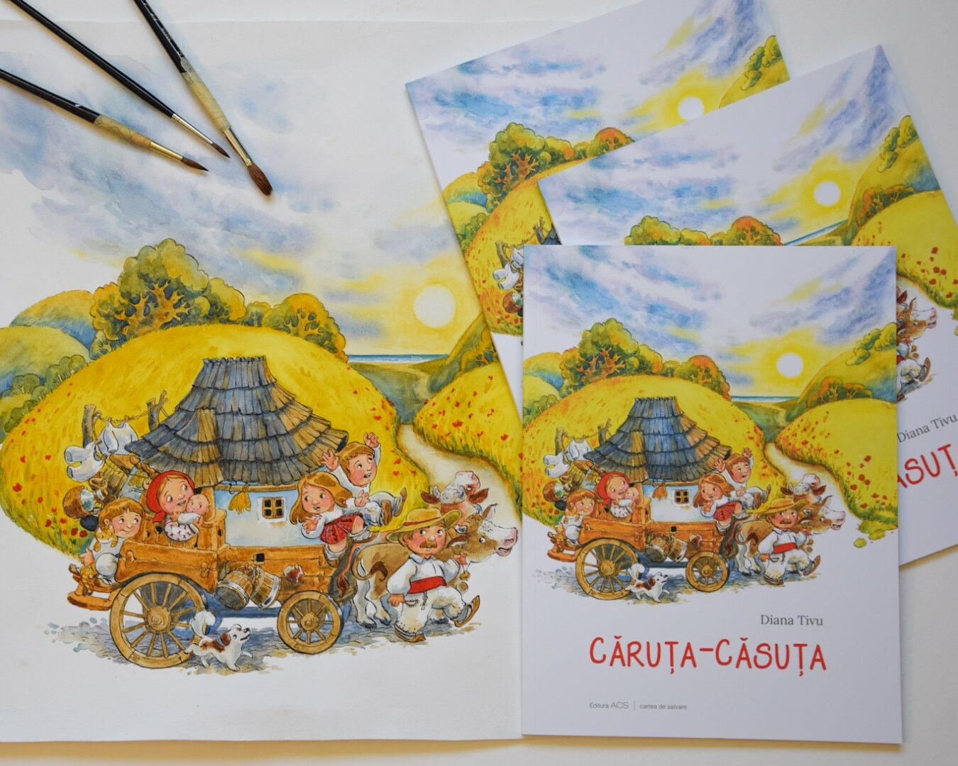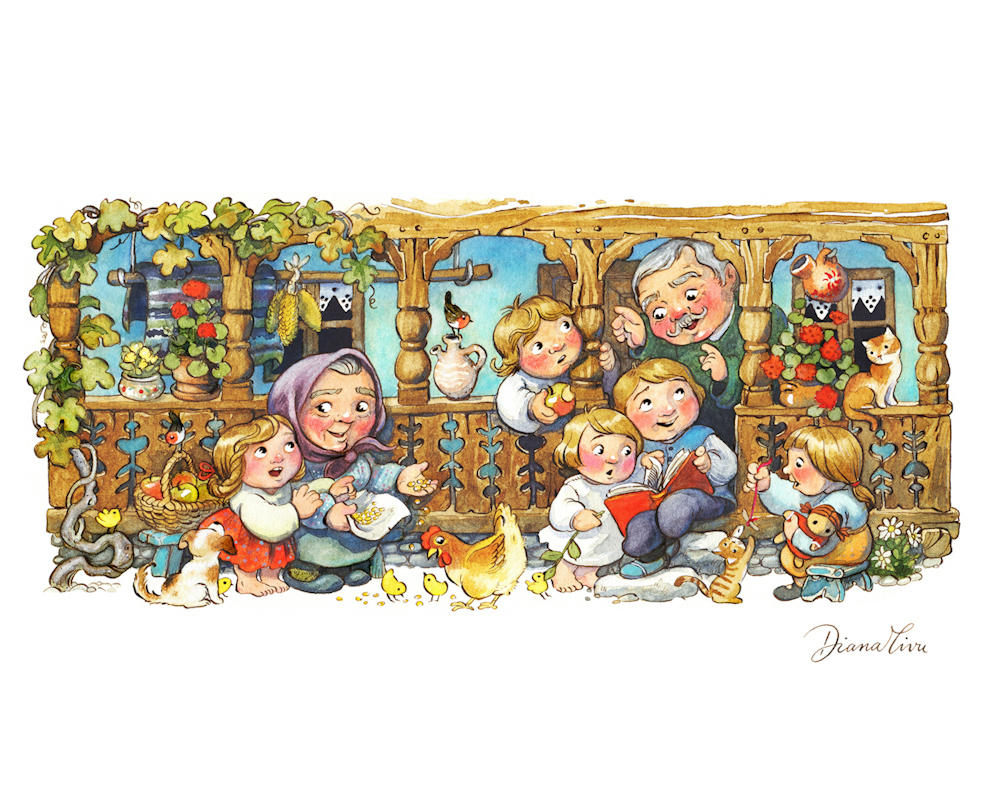 I kept working full time as an illustrator, while developing on my own stories, especially one about a whole world inspired by my love for elderly country life of Romanian villages, rural architecture, costumes, traditions. And by my very own experience as growing up at my grandparent’s farmyard at countryside, a boundless childhood with lots of animals, outside play and unsupervised tree climbing. It grew to embellish into a very large project with a wide range of illustrated stories that became subjects for art prints, souvenirs and a published picture book – “Căruța-căsuța” (“The wagon lodge”), for which I signed the text and illustrations.