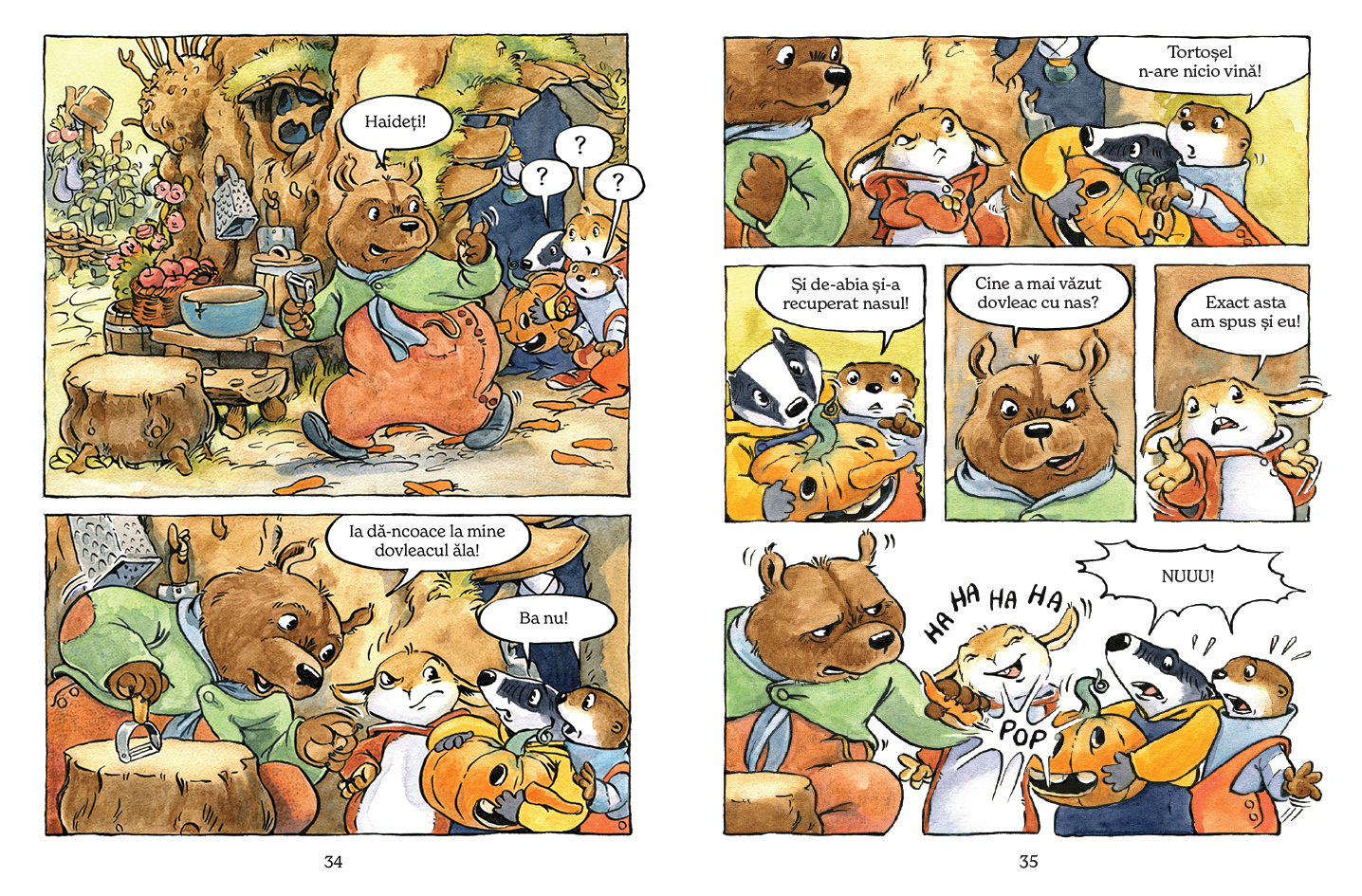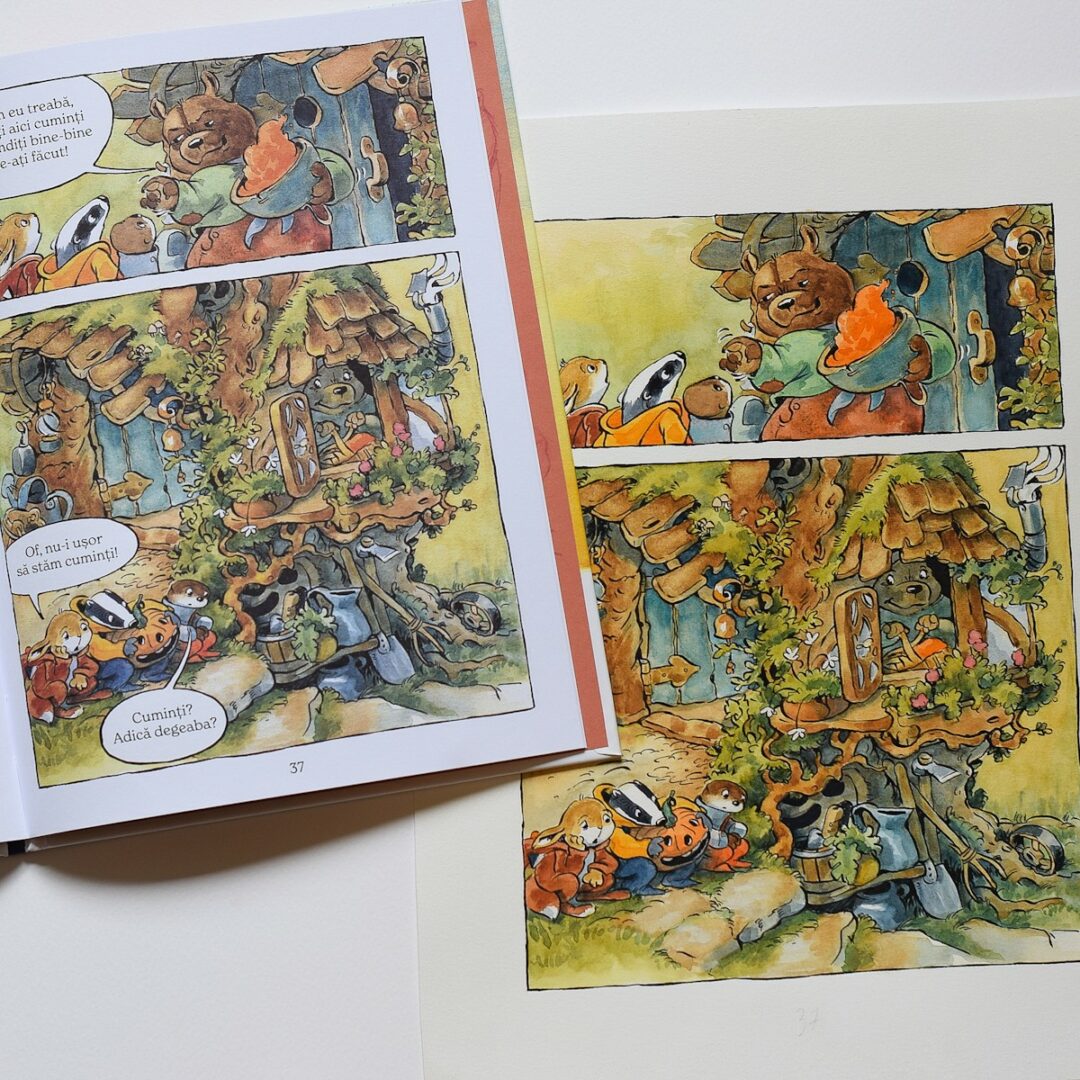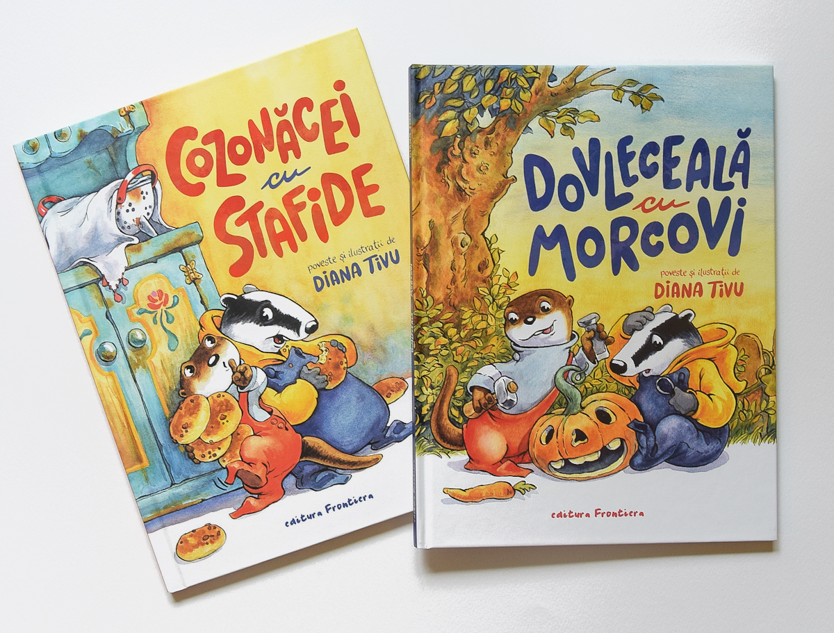 Last year i got a taste for telling stories in comic books and I felt in love all over again with the potential of my passion. I published a comic book album for toddlers – “Cozonăcei cu stafide” (“Little raisin pound cakes”), and this year a follow up – “Dovleceală cu morcovi” (“Pumpkining with carrots”), two funny mini stories that I wrote and illustrated, about a Badger and an Otter around a grumpy old Bear. Again, I had to go back to my childhood and inspire myself from my own mischief, growing up with my younger brother around our grandparents.