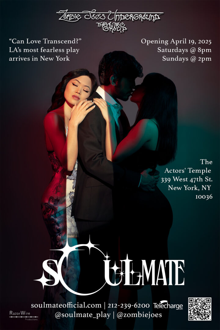 After selling out our initial performances and our extension, I decided to take “Soulmate” Off-Broadway in New York city where it opened in April of 2025 at the Actor’s Temple Theatre in the theater district of Manhattan, extending its run to the end of June. My lead for whom I wrote the play, Shannon Wong, joined me to reprise her role, as well as actress Sunn’e Ratcliff. The rest of the eight-person cast I auditioned and hired locally. This entire on-the-road adventure was documented via “The Soulmate Podcast” which I recorded and produced while doing everything else, available on YouTube and all podcast platforms. There, Shannon and I open up about our process and experience while interviewing members of the cast and production team. I also performed stand-up comedy to promote the play at St. Mark’s comedy club in the East Village, and produced several “Soulmate Shorts”; vertical video pieces that followed Soulmate’s characters on their adventures outside of the play’s primary narrative.