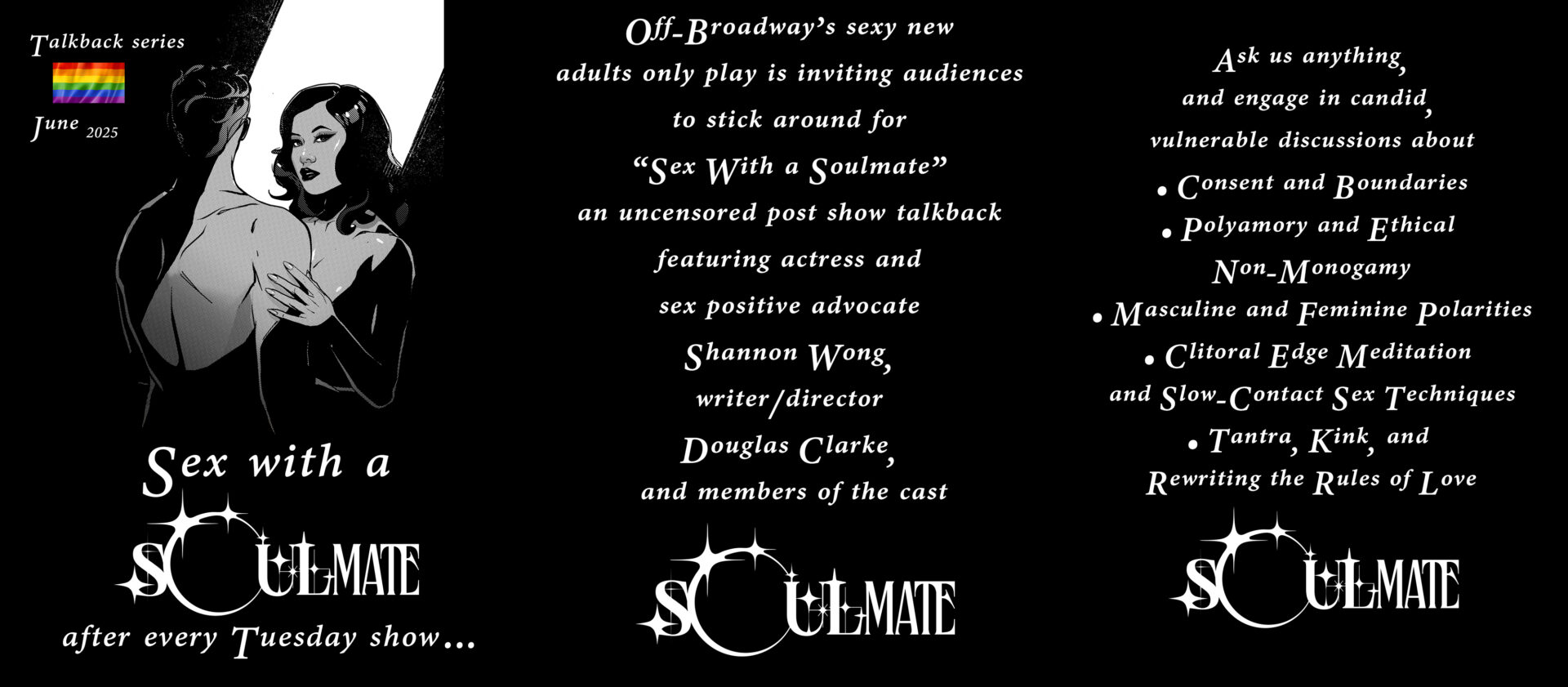The most fulfilling innovation that we had brought to our New York city production however, was our talkback series, “Sex with a Soulmate”. Since “Soulmate” did contain nudity and many adult, taboo themes, including polyamory, Shannon and I took the opportunity to exercise a passion that we both share; open conversation and education around intimacy, communication, and sexual dynamics; especially consent. We invited the audience and the cast to an open-ended dialogue that I led directly after every other performance, where no subject was off limits. Some of the moments shared during these conversations became my absolute favorite of the entire three month excursion. Though it would sometimes take time for an audience to open up, when they did, we ended up with some of the most significant breakthrough moments of vulnerability, connection, and transformation. Everyone expressed so much gratitude for such an open and accepting environment, where they could finally express things that had weighed on their hearts and minds; but for me and Shannon, we were simply creating the world that we wanted to live in.