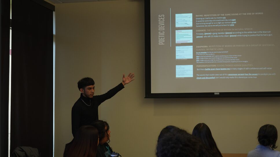 In the summer program, we had a summer showcase where each class got to showcase the projects they worked on. One poem that I had the opportunity to work on was a duo poem, where you create a poem with a group and then perform it. This poem absolutely changed my life. The duo poem, “Racismo,” was created by myself and a peer, and it took a stance on racism. When writing this poem, we envisioned sharing the experiences that the Latinx community faces. We discussed how the accomplishments of our community and our ancestors had been used against us, and yet our people are seen as less, often placed in a box and criminalized. Reflecting on that, we encouraged the audience to use that internal fire as motivation to change that perspective—that we, the people, are the change we wish to see in our communities.