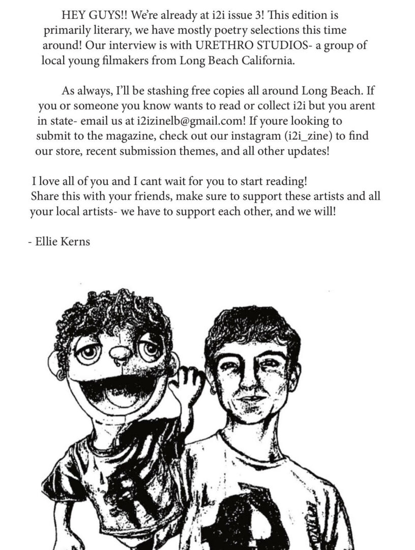 In 2024, with the help of some friends, I began to self-publish a cheap zine called i2i: a printed collection of writing, art, and interviews from locals of LA County. The experience has been so fulfilling and continues to remind me to support and uplift local artists.